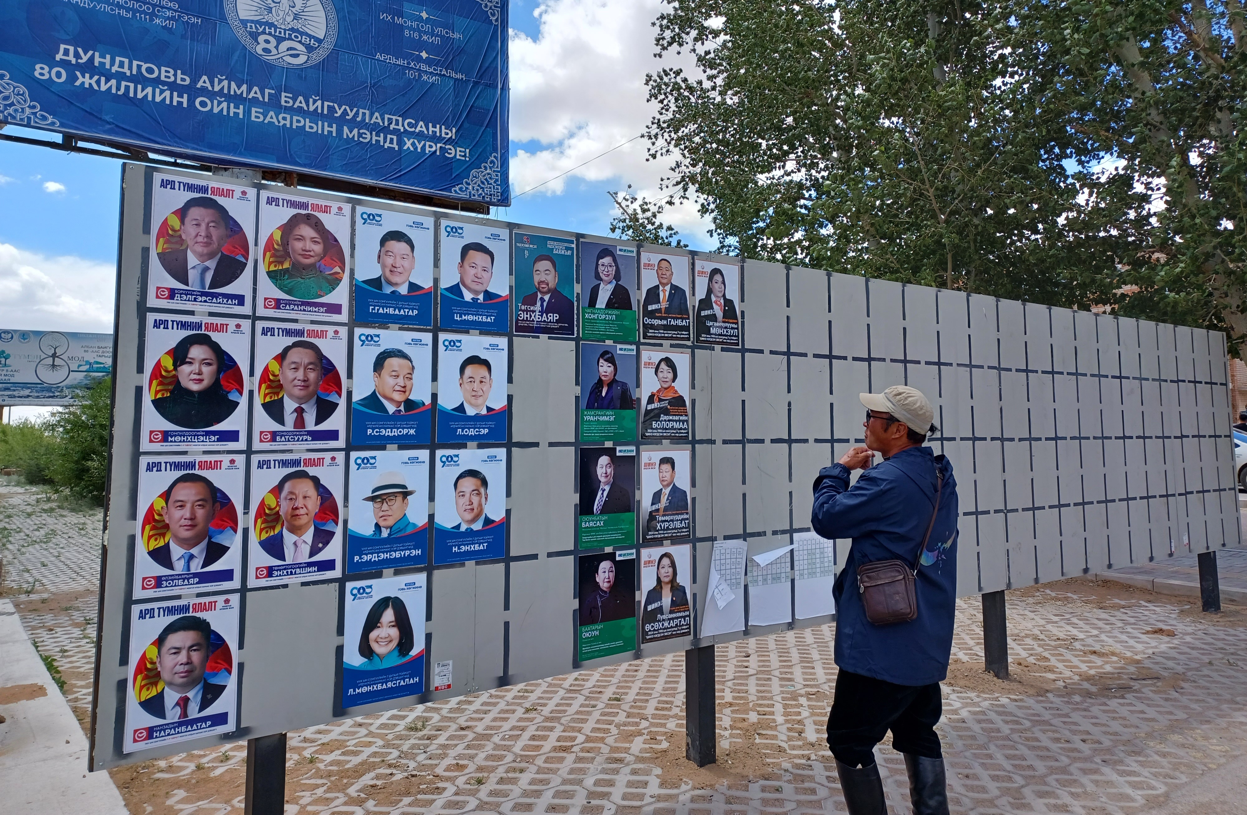 A voter in Mongolia’s parliamentary elections looks at candidate posters in Mandalgovi, Mongolia. 28 June 2024.