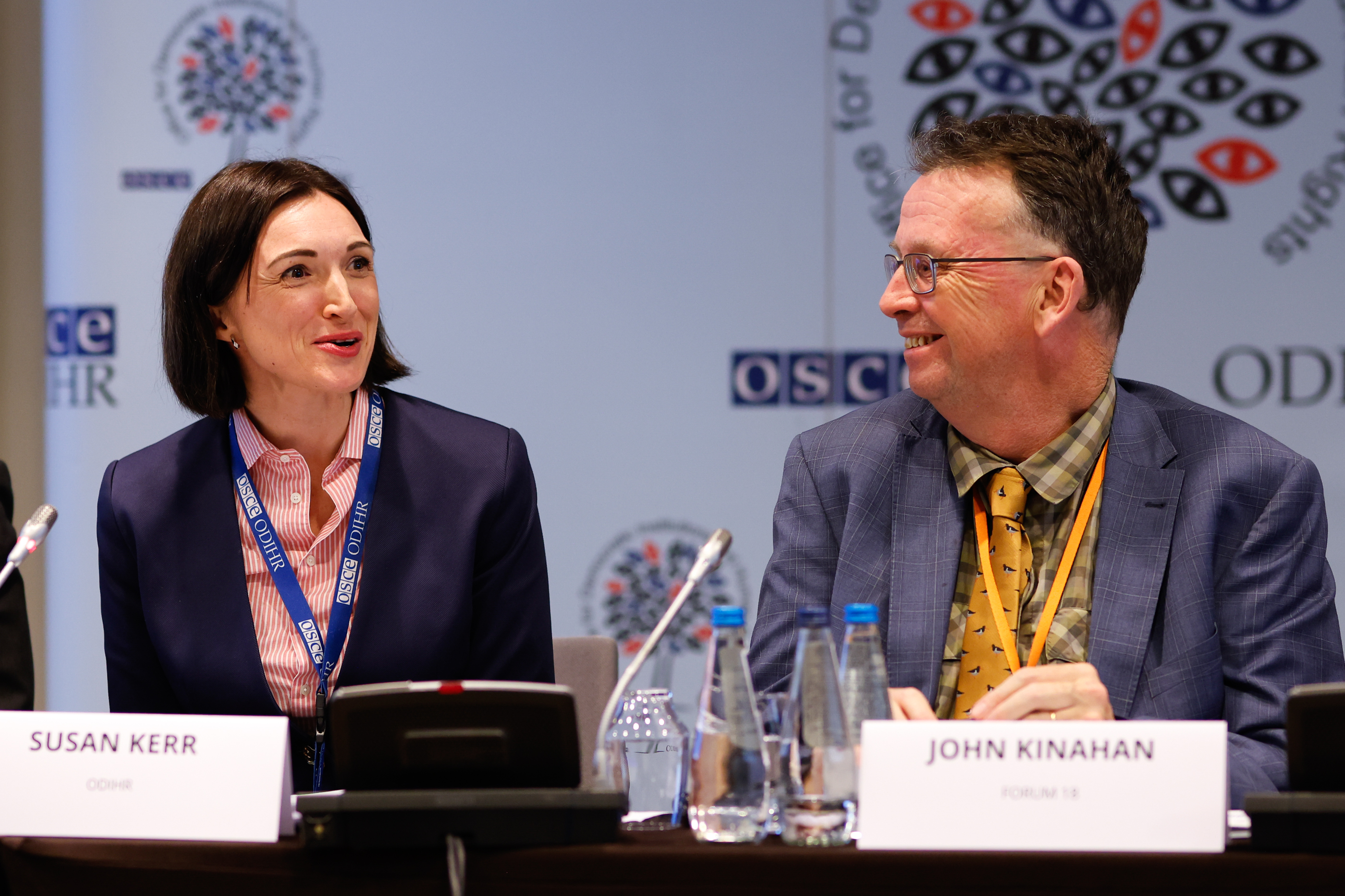 Susan Kerr, ODIHR Senior Advisor on Freedom of Religion or Belief and John Kinahan from Forum 18, speaking at the ODIHR’s launch of the Belief, Dialogue and Security Guide