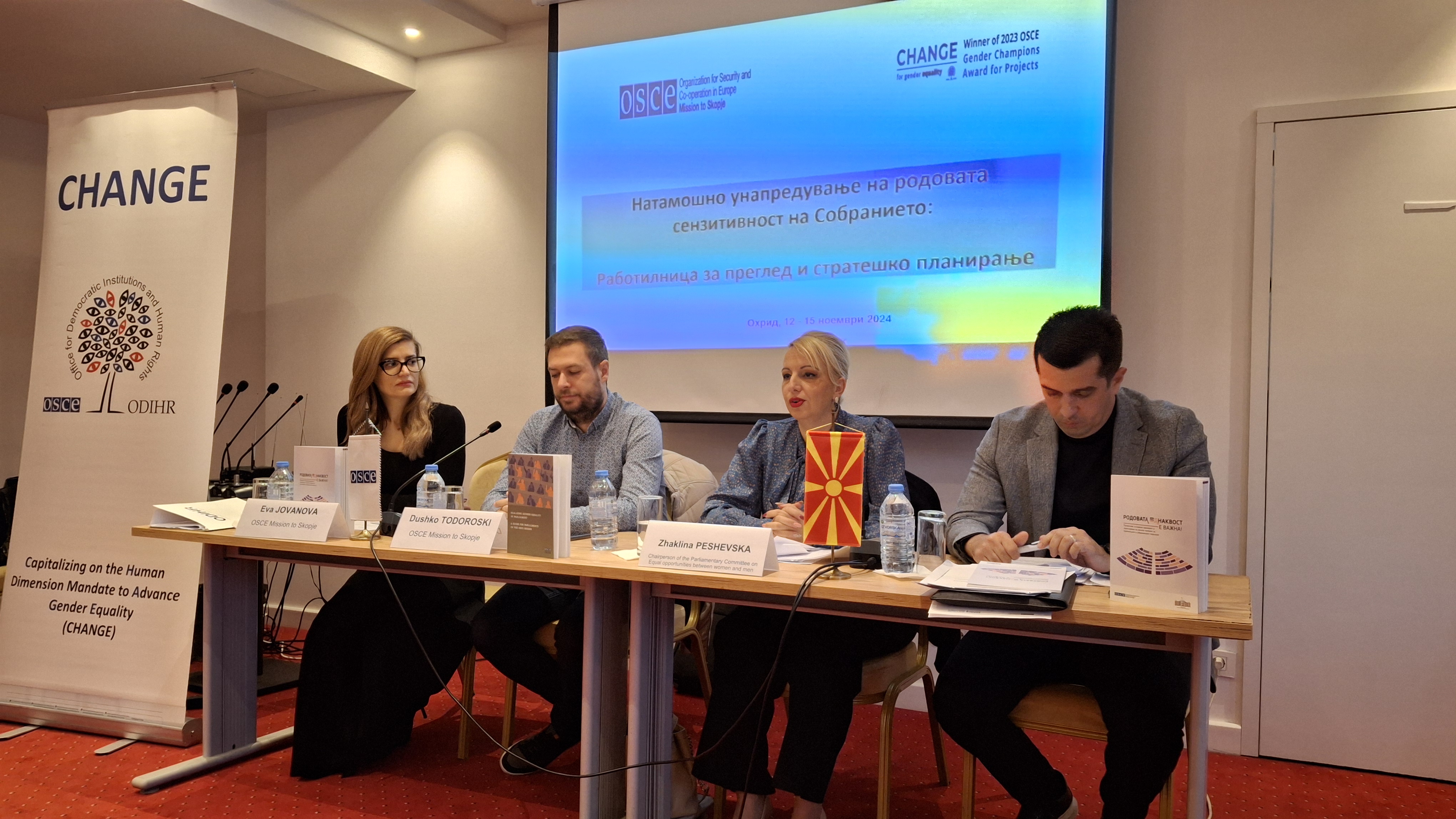 Eva Jovanova, OSCE Mission to Skopje; Dushko Todoroski, OSCE Mission to Skopje; Zaklina Peshevska, MP, Chairperson, Committee on Equal Opportunities for Women and Men; Boban Stojanoski, Deputy Secretary General during the CHANGE Review and Strategic Planning Workshop: Advancing further the gender sensitivity of the Assembly, Ohrid, North Macedonia, 13 November 2024.