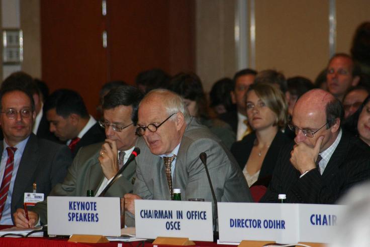 Thomas Hammarberg, Commissioner for Human Rights of the Council of Europe, addresses the opening plenary at the Human Dimension Implementation Meeting in Warsaw, 2 October 2006. On the left is OSCE Secretary General Marc Perrin de Brichambaut.