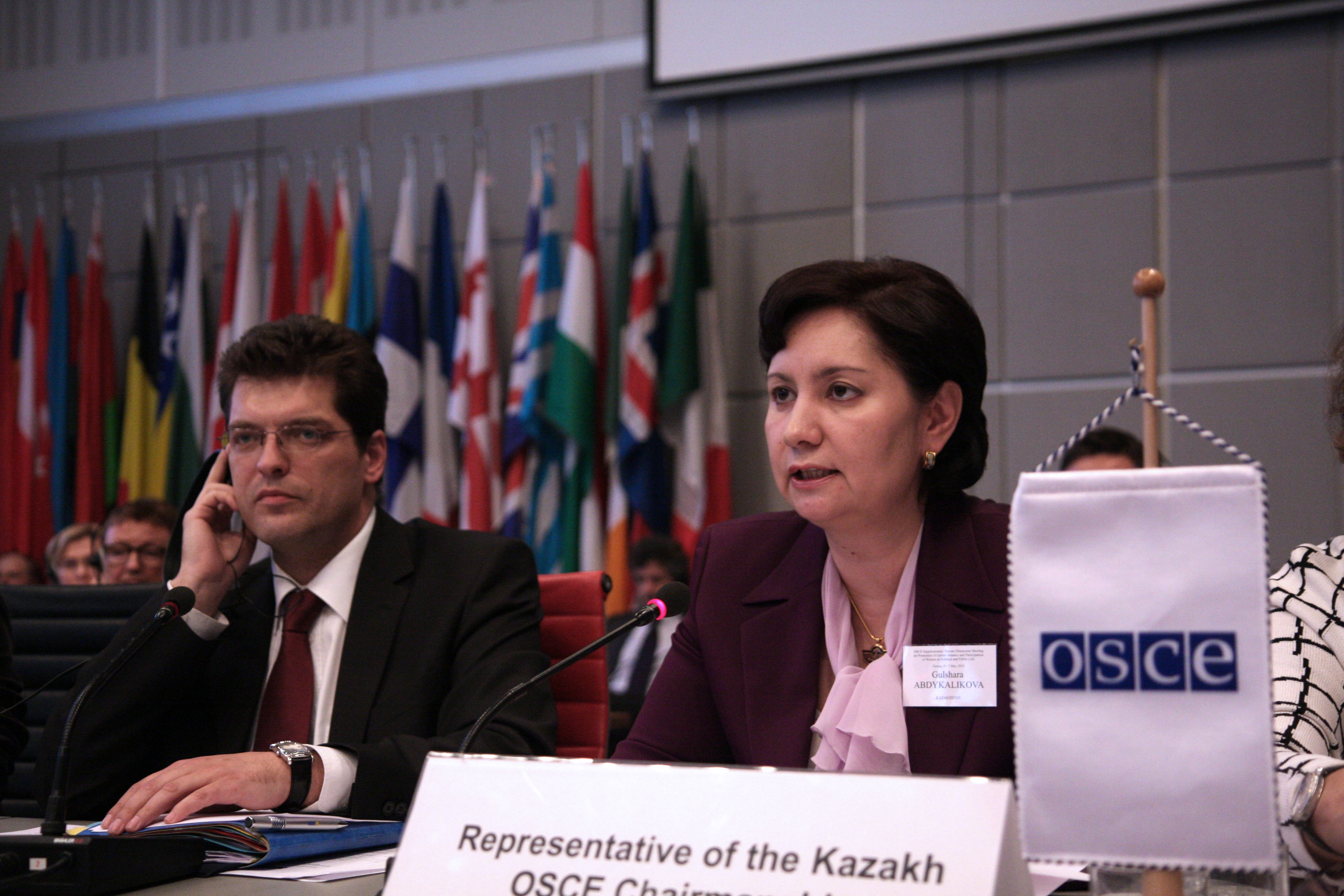 ODIHR Director Janez Lenarcic (left) listens as Kazakhstan's Minister of Labour and Social Protection, Gulshara Abdykalikova, addresses the opening of the Supplementary Human Dimension Meeting on gender balance, Vienna, 6 May 2010.