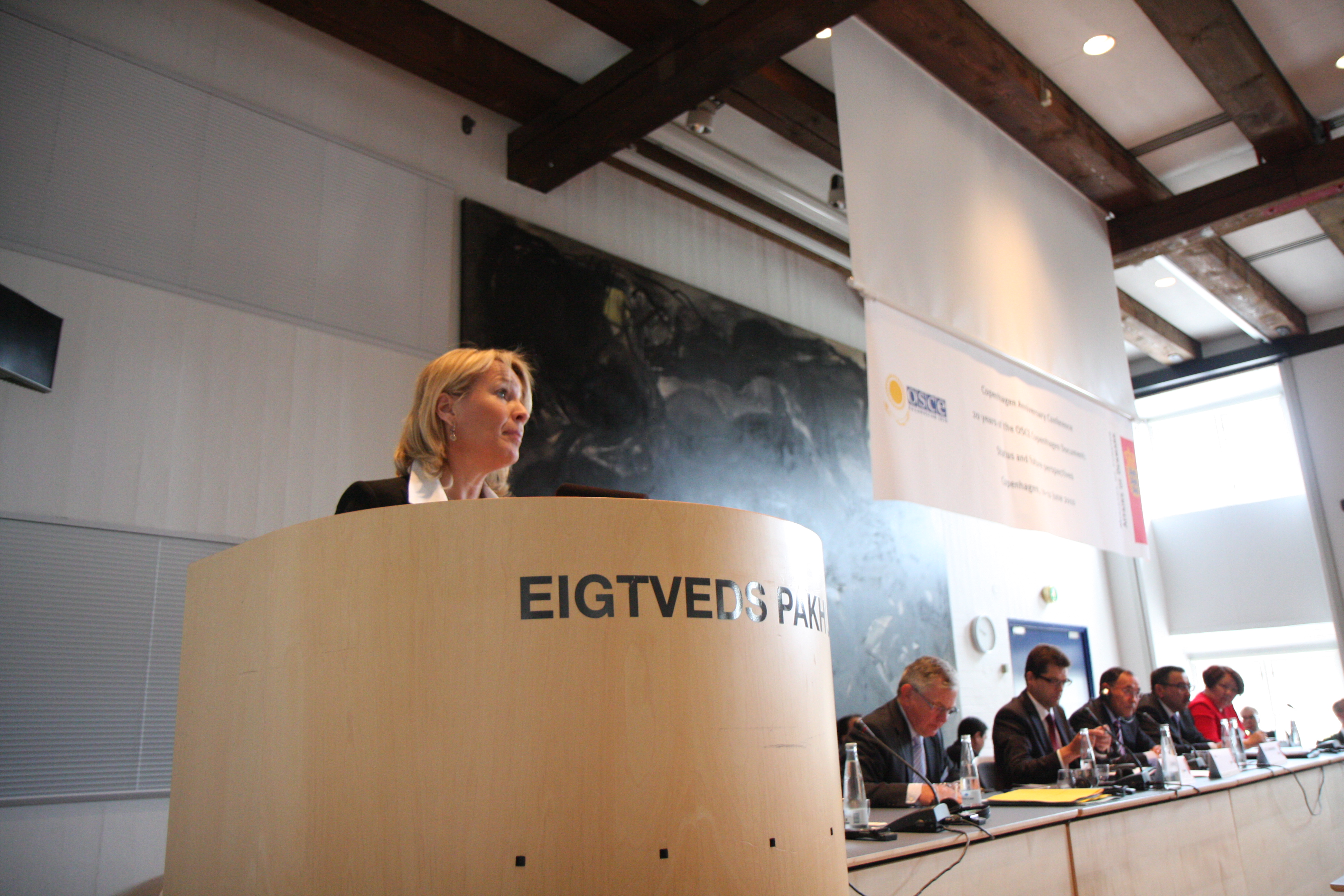 Danish Foreign Minister Lene Espersen addresses a conference to mark the 20th anniversary of the Copenhagen Document, 10 June 2010.