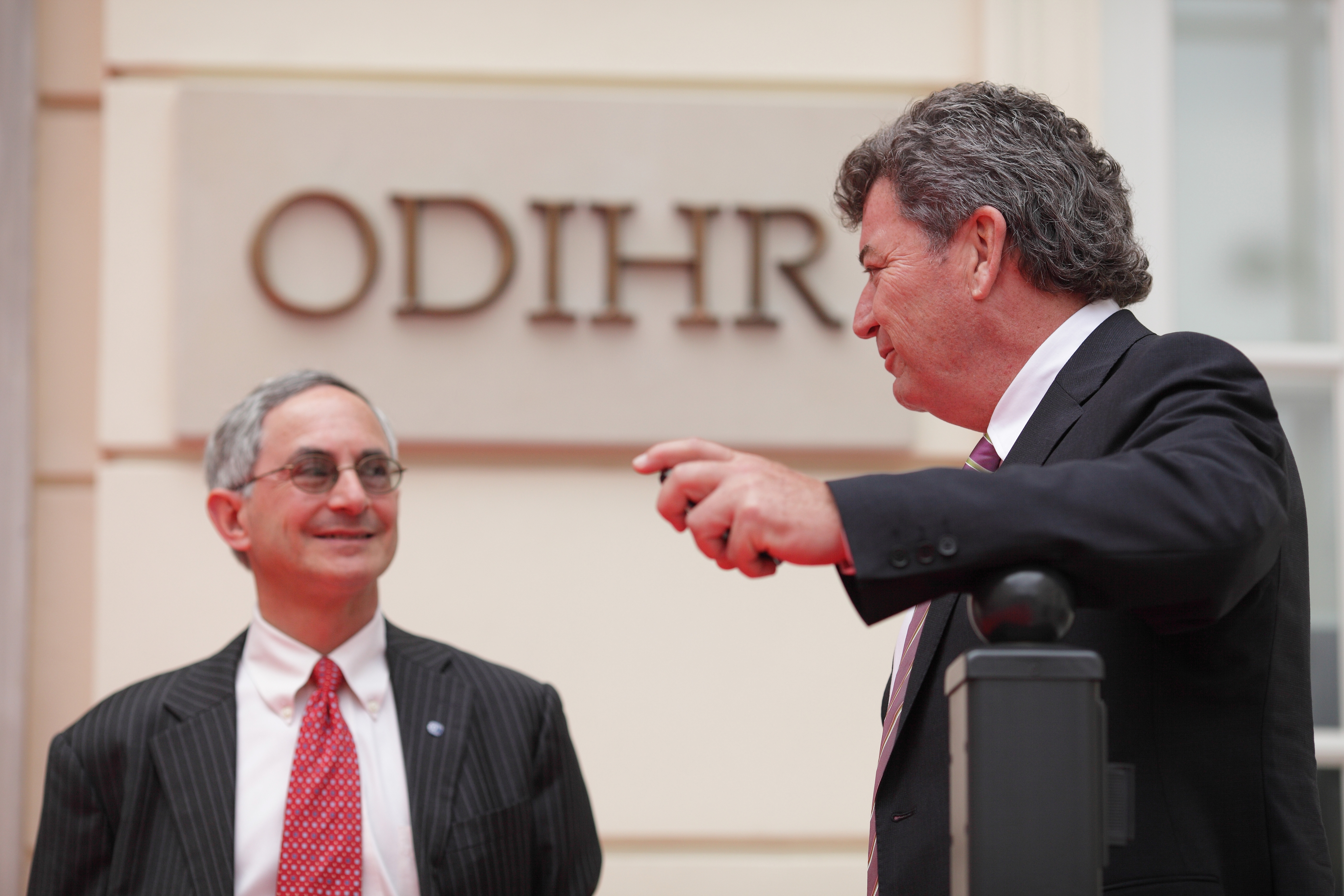 ODIHR First Deputy Director Douglas Wake (l) and Second Deputy Director Anthony Finnerty chatting prior to a ceremony to mark ODIHR's 20th anniversary in Warsaw on 17 May.