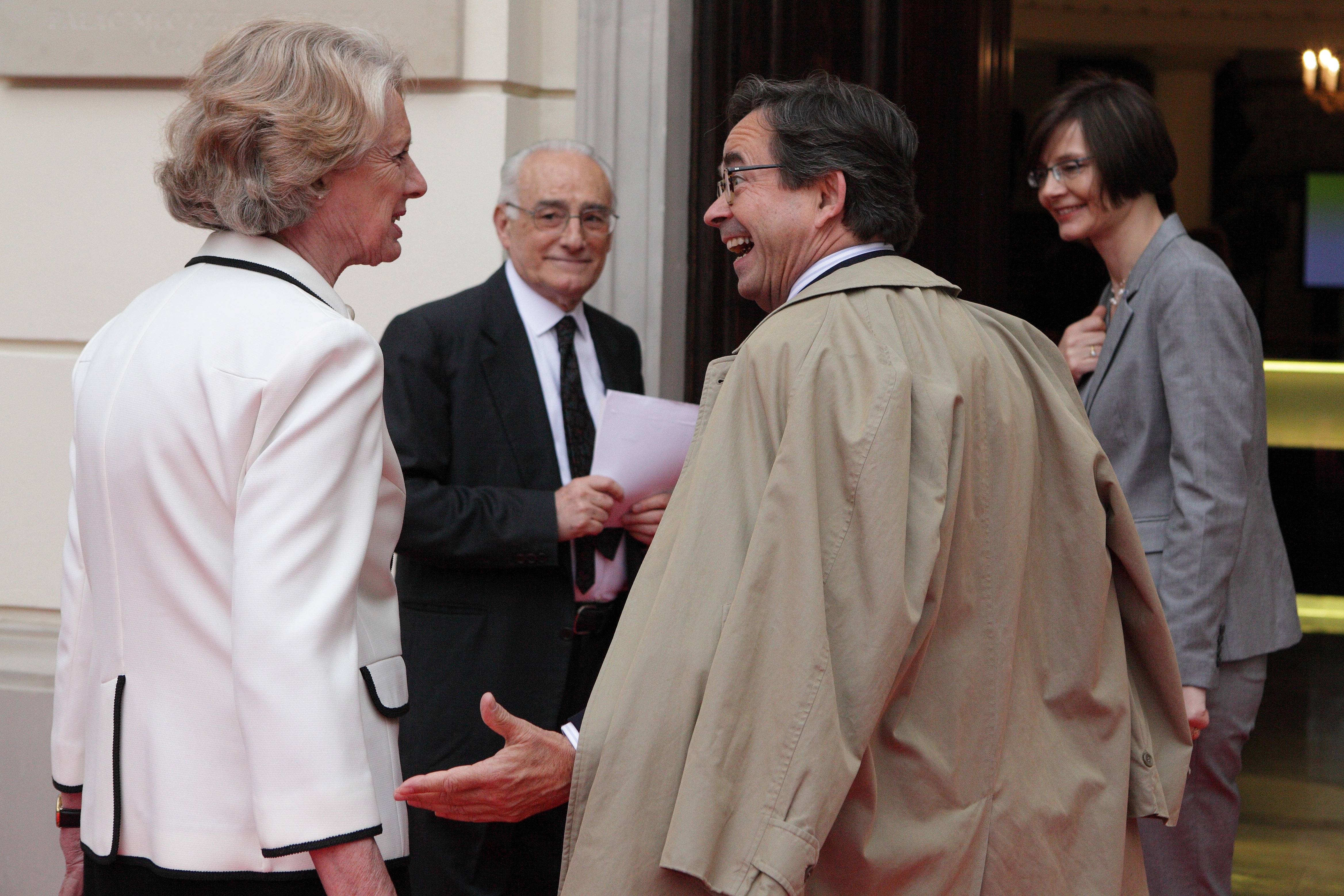 Former ODIHR Directors Audrey Glover (l) and Christian Strohal catch up prior to a ceremony to mark ODIHR's 20th anniversary in Warsaw on 17 May.