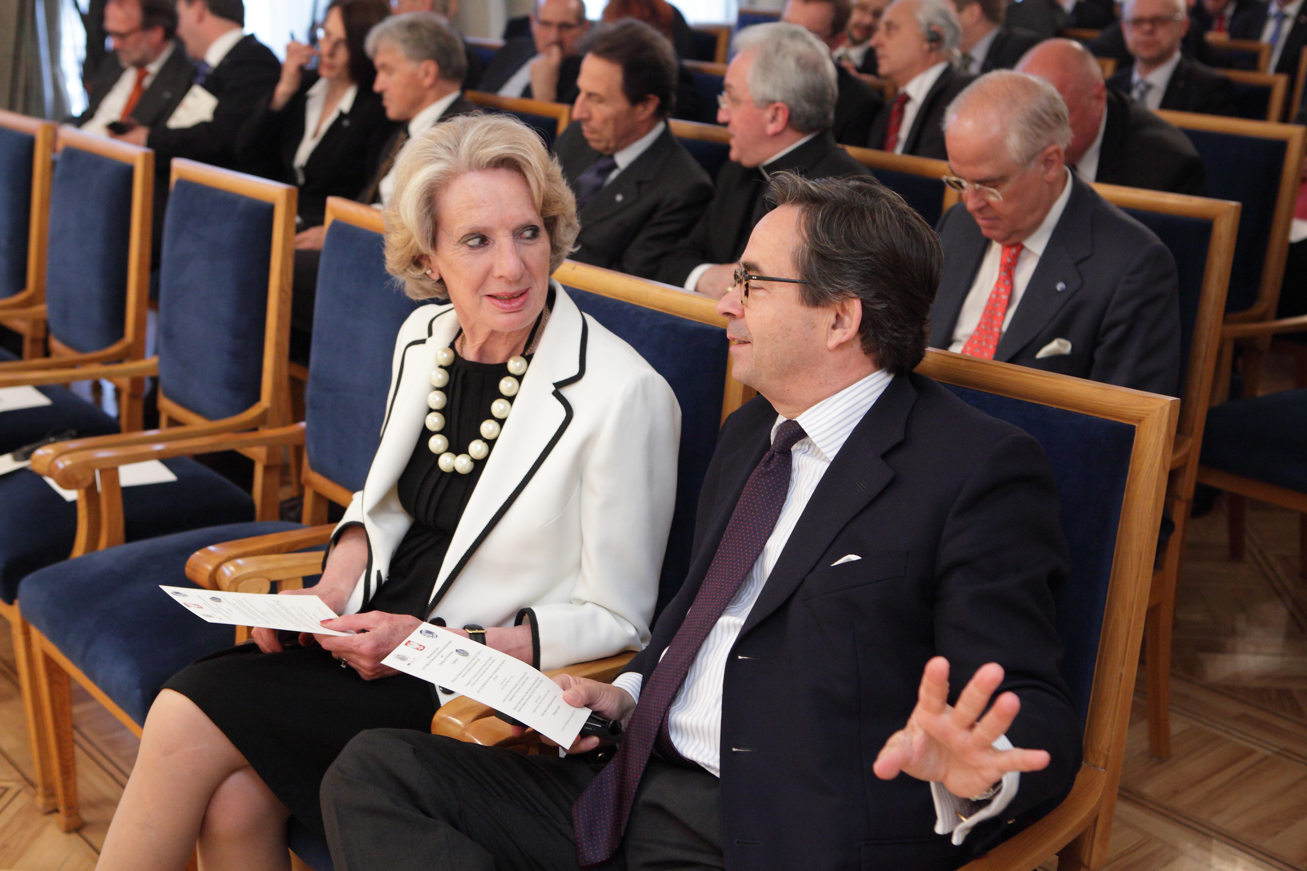 Former ODIHR Directors Audrey Glover (l) and Christian Strohal catch up at a ceremony to mark ODIHR's 20th anniversary in Warsaw on 17 May.