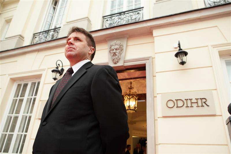 Noah Lane, ODIHR's Security and Logistics Officer, standing in front of the ODIHR office prior to a ceremony to mark ODIHR's 20th anniversary in Warsaw on 17 May.