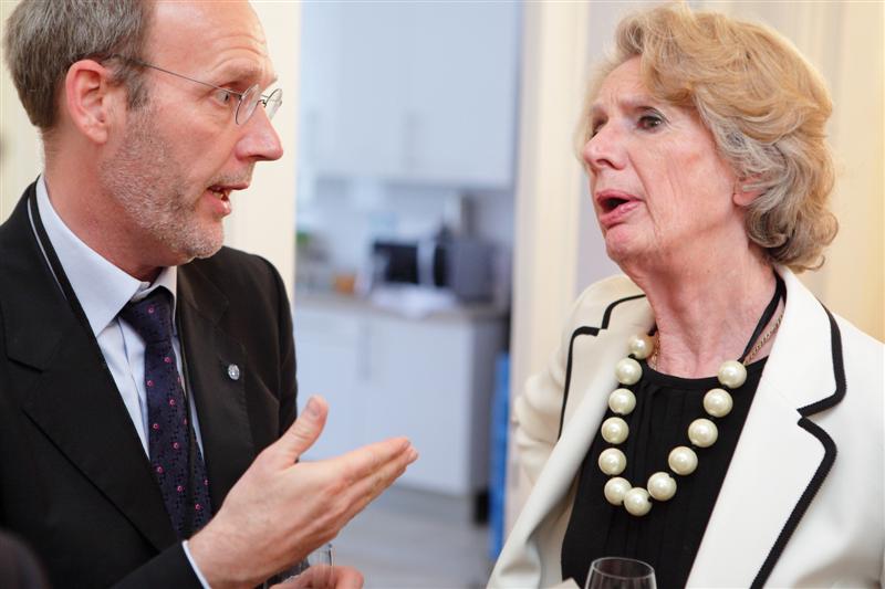 The Head of ODIHR's Democratization Department, Thomas Vennen, speaking with former ODIHR Director Audrey Glover at a ceremony marking ODIHR's 20th anniversary, held in Warsaw on 17 May.