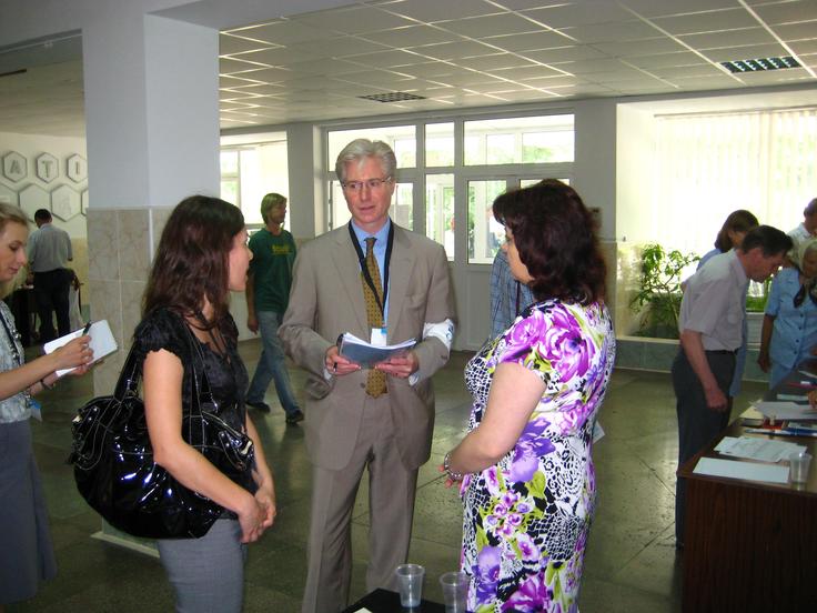Gerald Mitchell (centre), head of ODIHR's limited election observation mission to the 5 June local elections in Moldova, speaks with the president of the precinct election board at a polling station in Chisinau on election day.