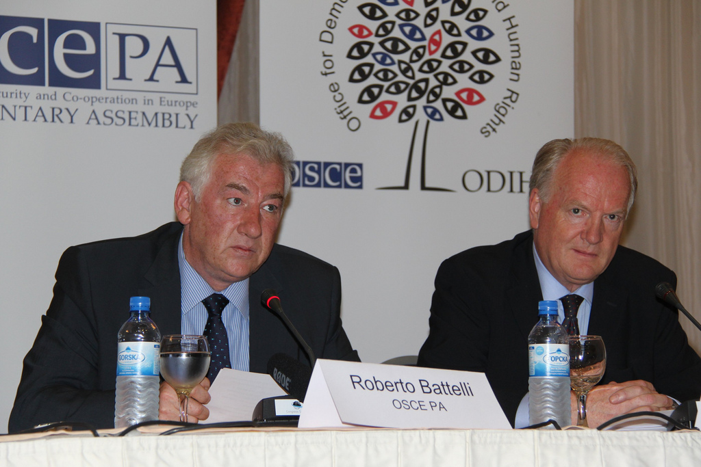 Roberto Battelli, Special Co-Ordinator to lead the short term OSCE observer mission and Julian Peel Yates, head of the OSCE/ODIHR observation mission, speak to reporters in Skopje on 6 June 2011 following early parliamentary elections.