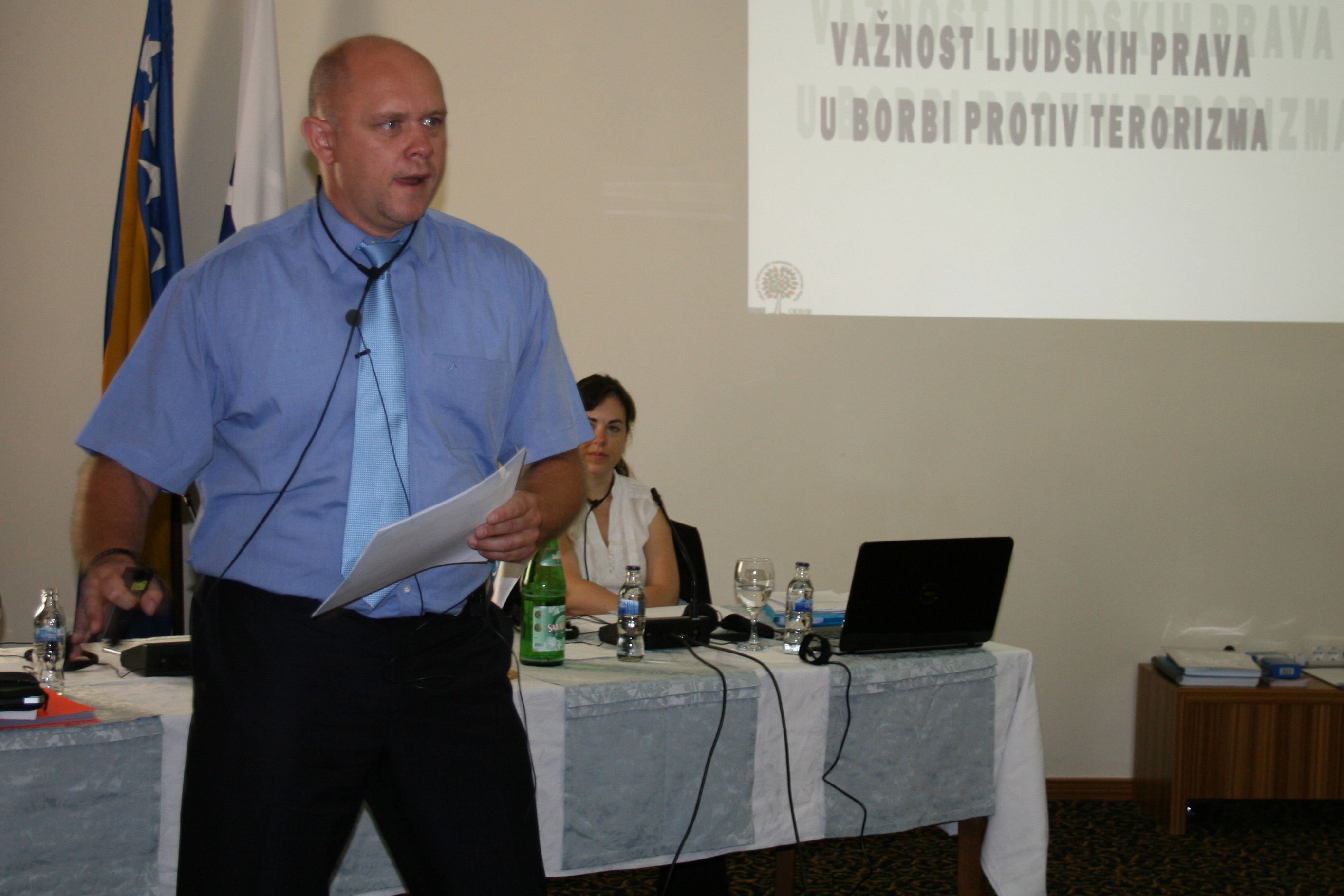 Police trainer Jean-Pierre Devos explains the importance of respecting human rights during counter-terrorism activities at a training course organized by the OSCE Office for Democratic Institutions and Human Rights (ODIHR), the OSCE Mission to Bosnia and Herzegovina and the Ministry of Security of Bosnia and Herzegovina, Sarajevo, 16 September 2011.