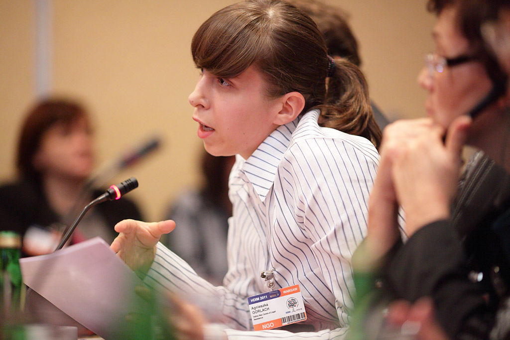 Agnieszka Gorlach, a lawyer from the Krakow-based Halina Niec Legal Aid Centre described the findings of an ODIHR supported project involving a series of visits to immigration detention facilities, during a side event on preventing child trafficking held at the OSCE Human Dimension Implementation Meeting in Warsaw, 6 October 2011.