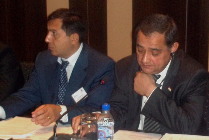 Armen Harutyunyan (l), Office of the United Nations High Commissioner for Human Rights Regional Representative for Central Asia, and Zarif Alizoda, Human Rights Ombudsman of Tajikistan, at a workshop on national human rights institutions in Dushanbe, 12 October 2011.