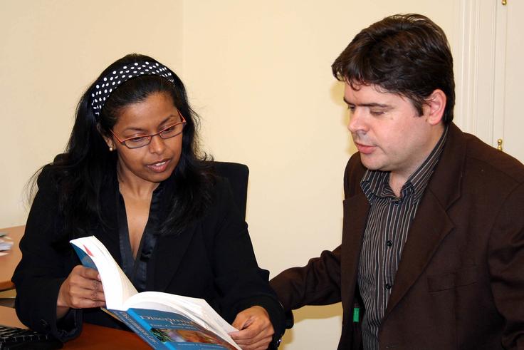 Nasrin Khan (left), co-drafter of the ODIHR's legislative guidelines on hate crime, discusses discrimination law with a colleague.