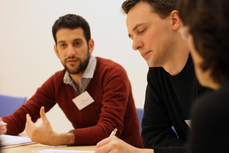 Pablo Rojas Coppari (l), from the non-governmental organization Migrants’ Rights Centre Ireland, and Paul Yates, from the Freshfields Bruckhaus Deringer law firm, share experiences at a meeting to discuss the establishment of an OSCE-wide network of legal practitioners to improve access to justice and effective remedies for trafficking victims. Warsaw, 3 April 2012.