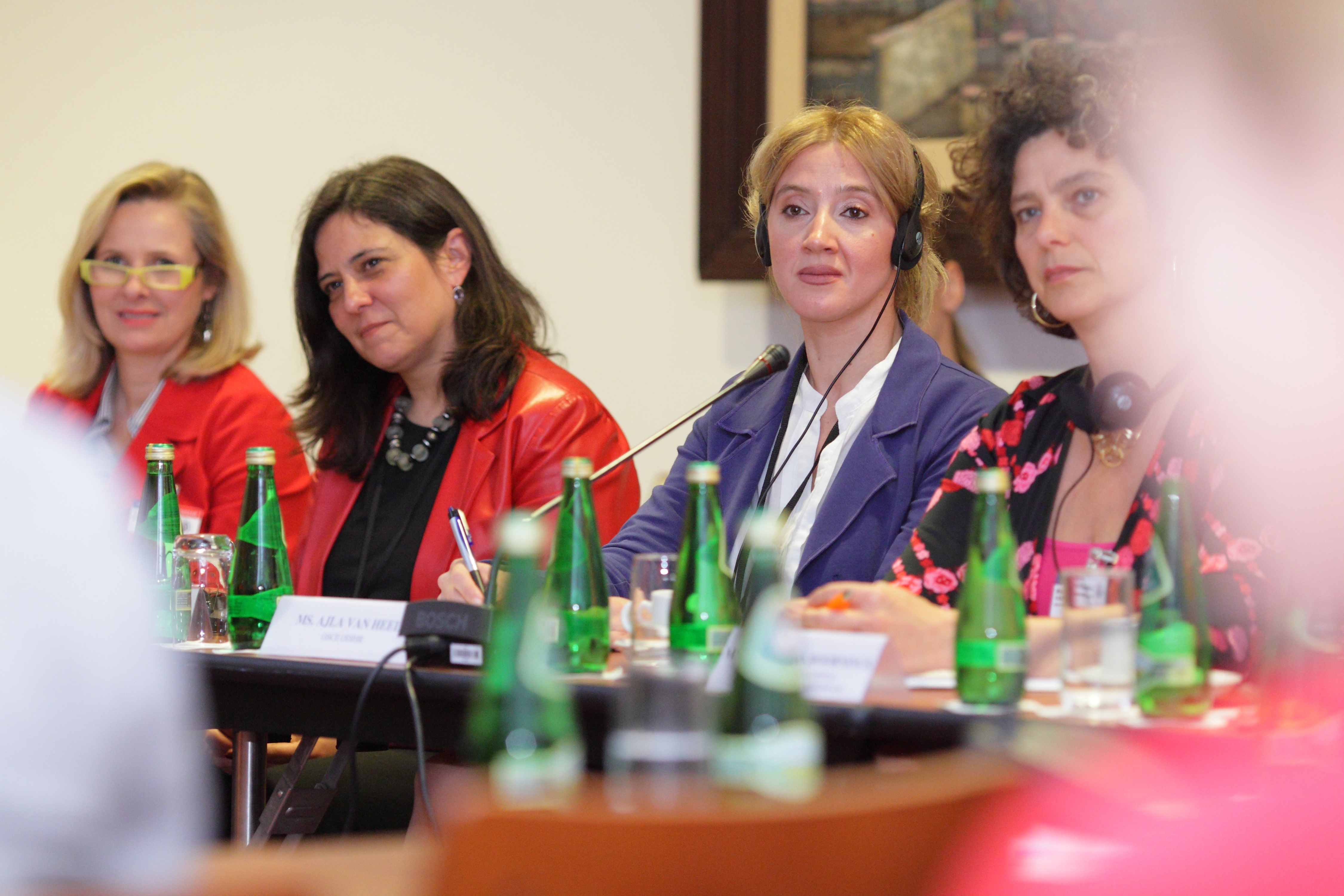 (L-r) Cindy Dyer, Vice-President of the non-governmental organization Vital Voices Global Partnership; Mariana Katzarova, ODIHR’s Senior Adviser on Anti-Trafficking Issues; Ajla van Heel, ODIHR Gender Officer, and Marieke van Doorninck, City Councillor in Amsterdam, moderate discussions at the OSCE event, “Political leadership: Who can speak for the victims of trafficking?” Warsaw, 15 May 2012.