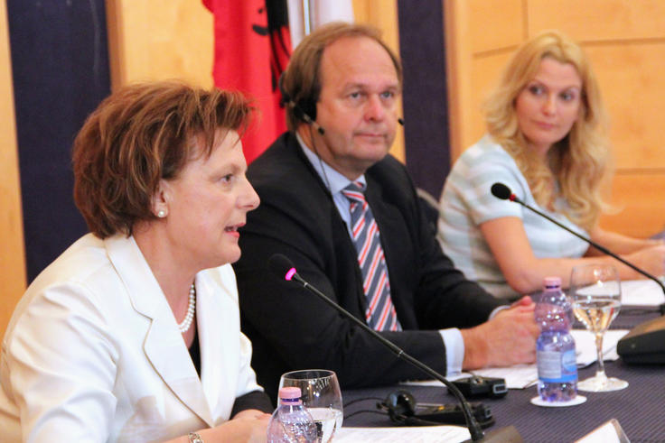 (L-r) Chair of the Albanian parliamentary committee on Education and Media, Valentina Leskaj; Head of the OSCE Presence in Albania, Ambassador Eugen Wollfarth, and Member of Parliament Mesila Doda address a national conference on increasing women's participation in political parties, organized by ODIHR in co-operation with the OSCE Presence, Tirana, 18 June 2012.