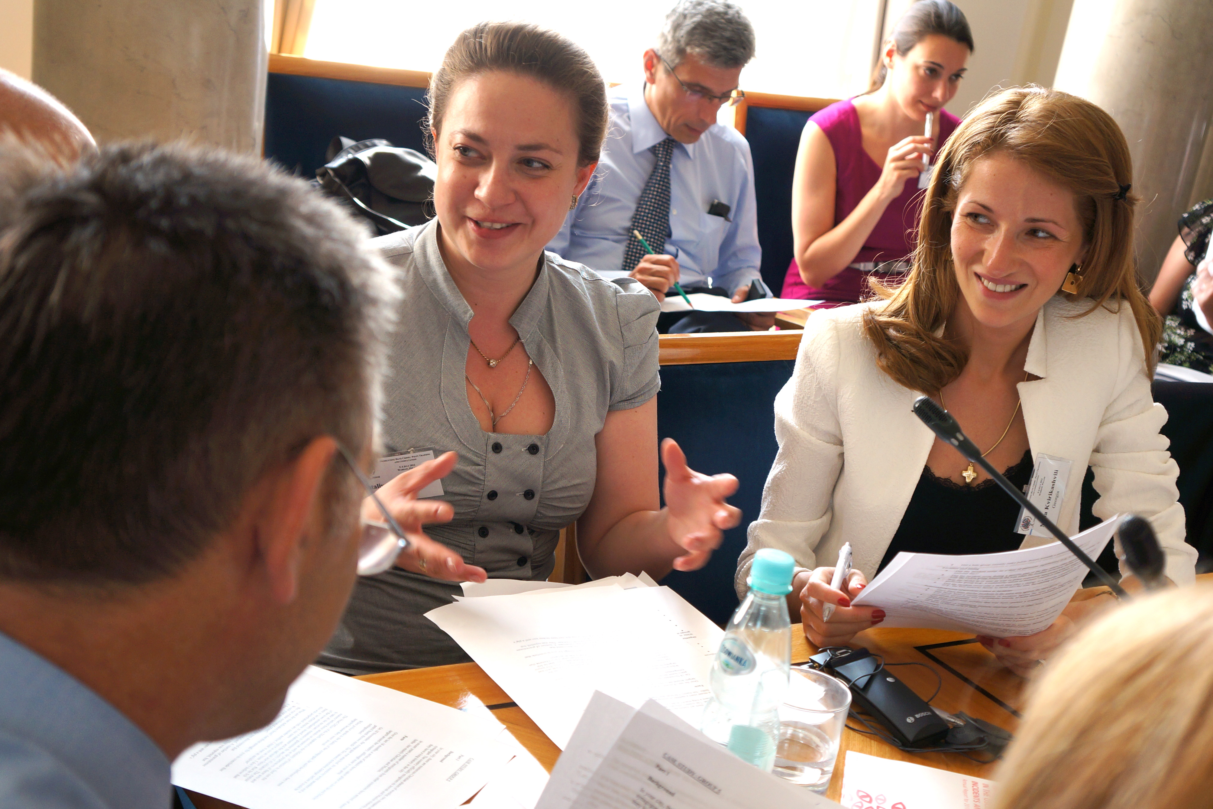 Nataliya Dryomina-Voloc (l), from the National Academy of the Public Prosecutor's Office of Ukraine, and Maia Kvirikashvili, from the Chief Prosecutor’s Office of Georgia, discuss a case study during a pilot training session for prosecutors, organized by ODIHR, on the effective prosecution of hate crime cases, Warsaw, 5 July 2012.