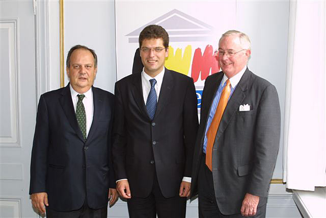 ODIHR Director, Ambassador Janez Lenarcic (centre), meets the President of the OSCE Parliamentary Assembly, Joao Soares (left), and the Assembly's Secretary General, Spencer Oliver, in Copenhagen on 16 July 2008.