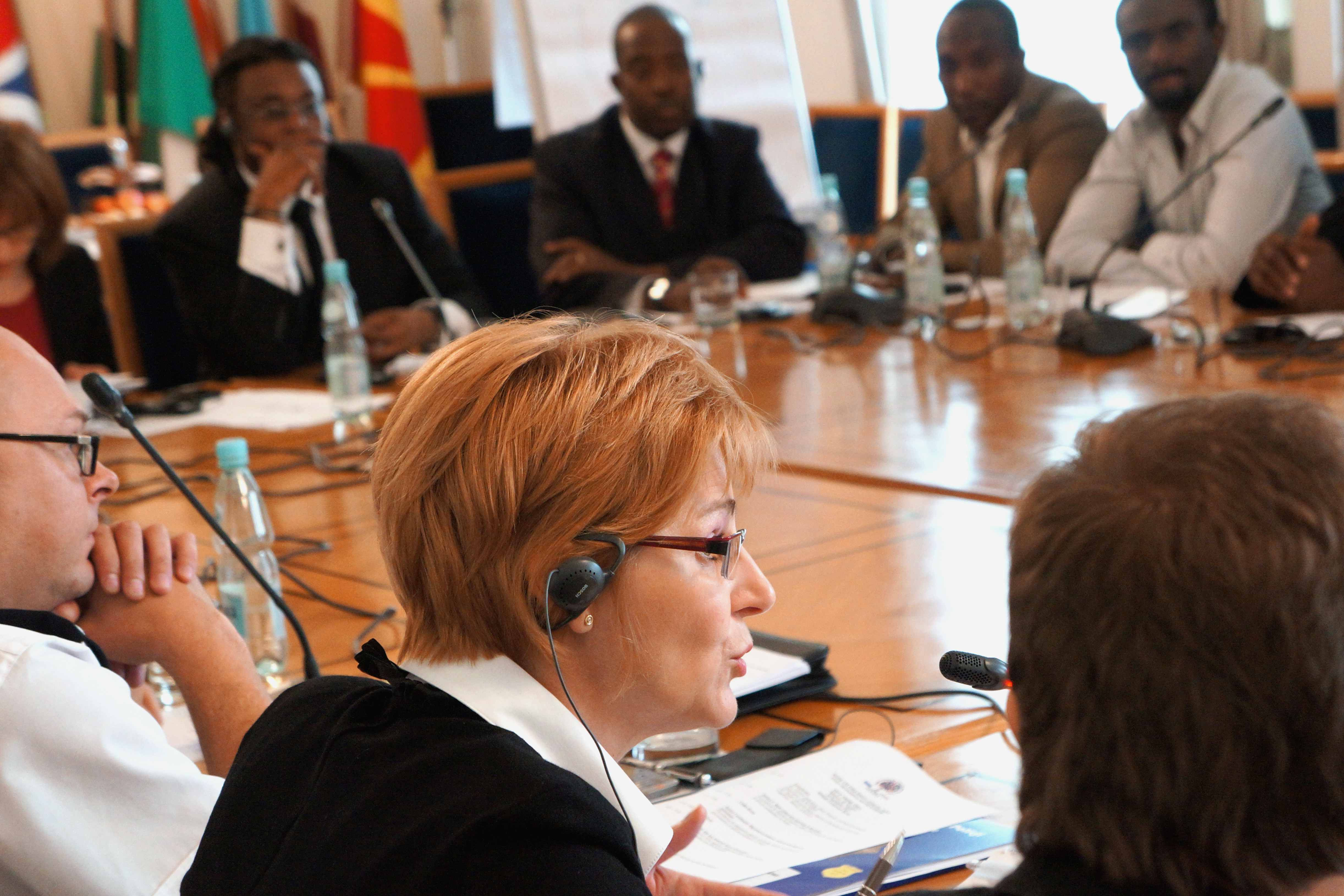 Bogumiła Bogacka, Inspector at the Capital Command of Police in Warsaw, addresses an ODIHR-organized meeting of representatives of the Polish Ministry of Interior, police officials, border-guard and immigration officers, and members of the African community in Poland. Warsaw, 19 September 2012.