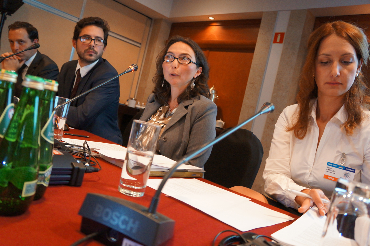 (L-r) Alex Conte, Representative to the UN for the International Commission of Jurists; Benjamin Moreau, Chief of ODIHR’s Rule of Law Unit; Maria Alcidi, ODIHR Rule of Law Officer, and Pipina Katsaris, lawyer specialized in international and criminal law, present ODIHR’s new trial monitoring tools during the Human Dimension Implementation Meeting, Warsaw, 26 September 2012.