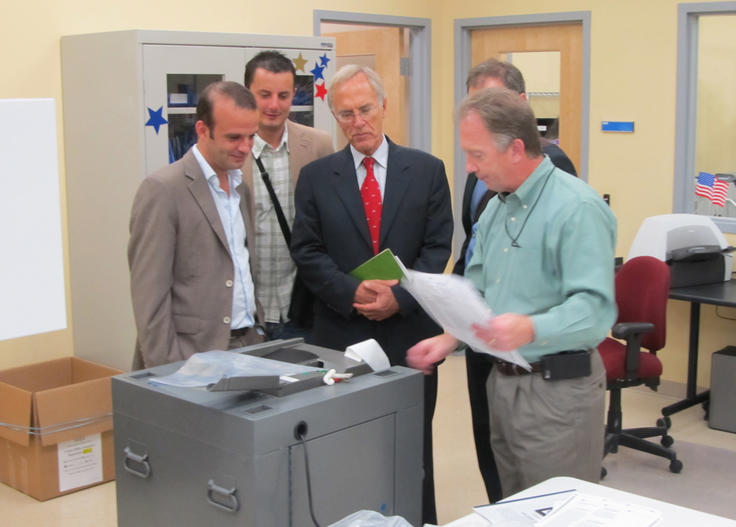 (L-r) Eric Des Pallieres and Dragan Zelić, Long-term observers from the OSCE/ODIHR Limited Election Observation Mission to the 6 November 2012 General elections in the United States; Daan Everts, the Head of the Mission, and Goran Petrov, the Mission’s Election Analyst, watch Mark Anderson, Election Supervisor of Bay County, collect the printout from a ballot scanning machine during a test. Panama City, Florida, 24 October 2012.
