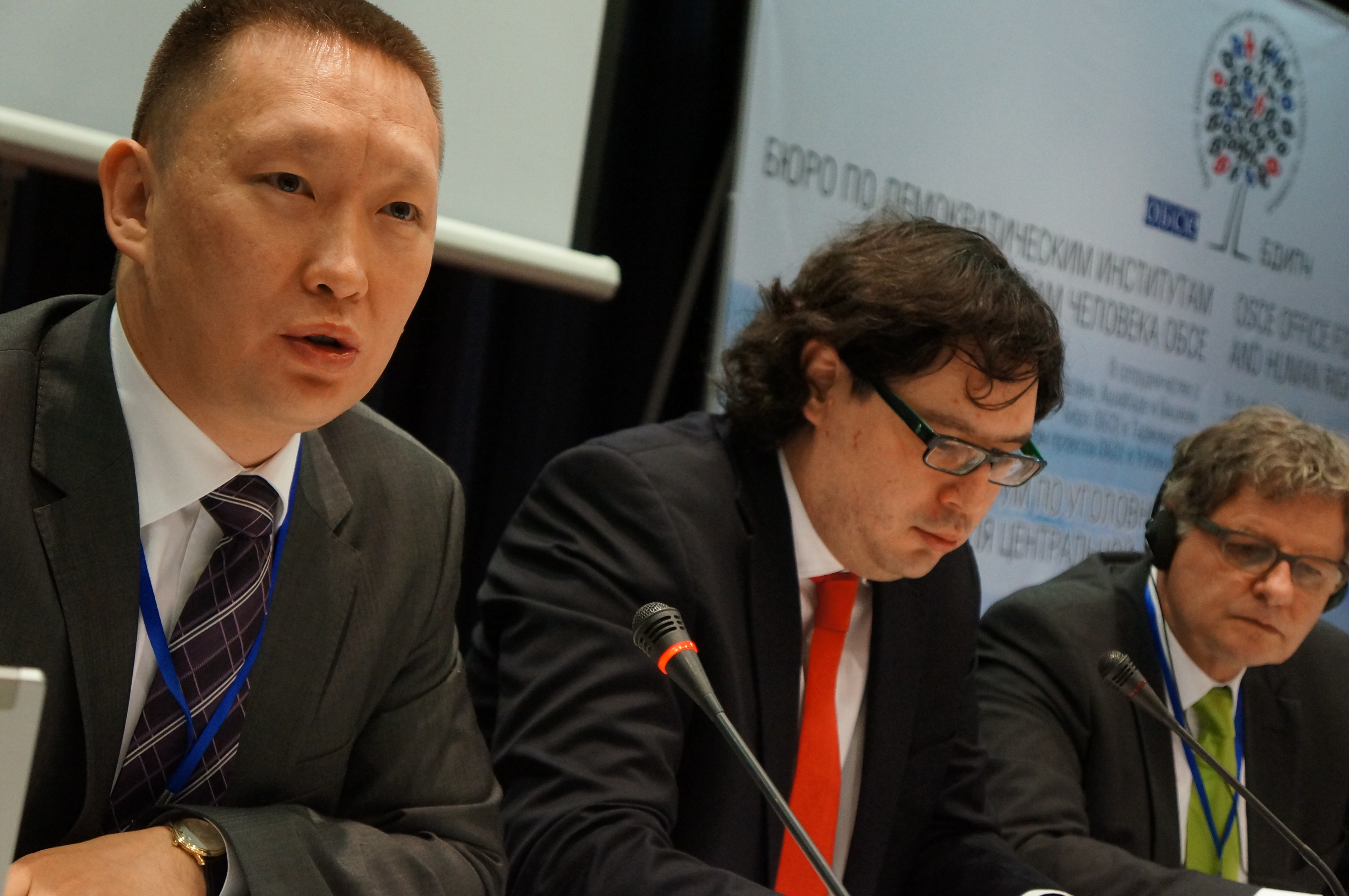 (L-r) Daniyar Kanafin, Defence Attorney at the Almaty City Bar, speaks as Dmitry Nurumov, Legal Adviser at the OSCE High Commissioner on National Minorities, and Richard Soyer, Professor of Criminal Law at the Johannes Kepler University in Linz, listen at a discussion on the role of the investigator in criminal proceedings, and the impact that reform of this role would have on the limits of police investigation. Almaty, 29 October 2012.