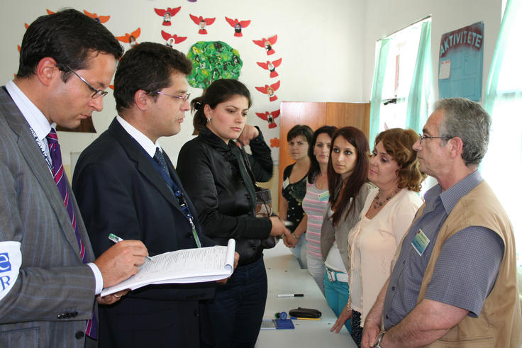 ODIHR Director Ambassador Janez Lenarcic (second left) speaks to election commission members at a polling station during Albania's parliamentary elections, 28 June 2009.