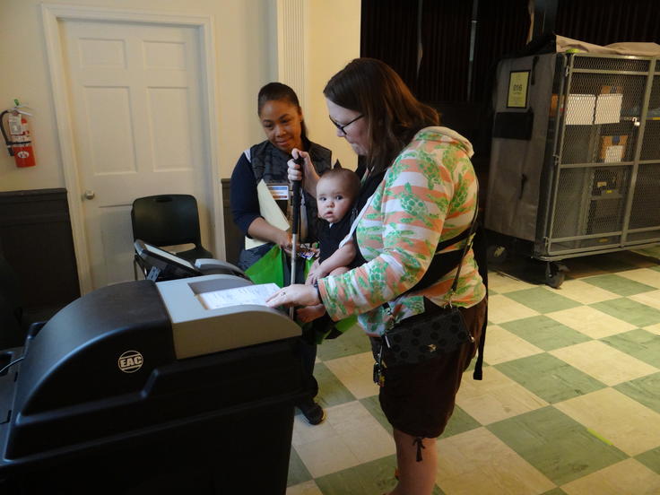 A voter casting her ballot in a voting machine in Lyon Village, Virginia, during the United States mid-term elections, 6 November 2018.