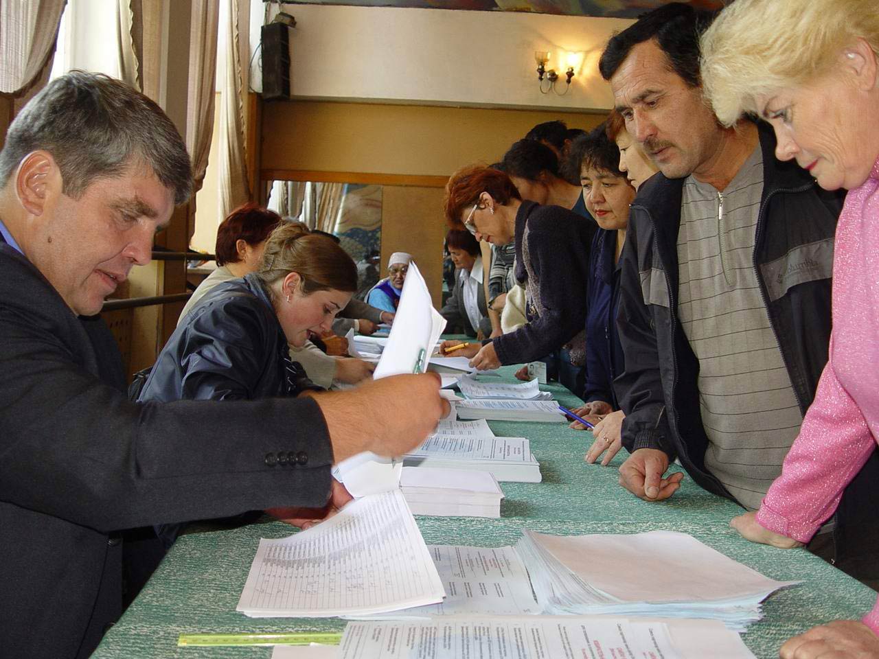Election officials at a polling station in Malinovka check names in the voter registry before handing out ballots during the parliamentary elections in Kazakhstan, 19 September 2004.