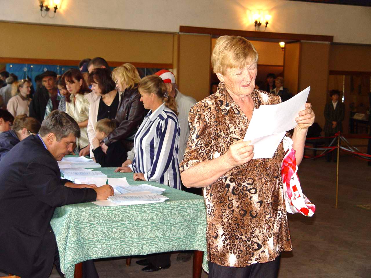 A voter in the town of Malinovka examines her ballot while waiting to vote during parliamentary elections in Kazakhstan, 19 September 2004.