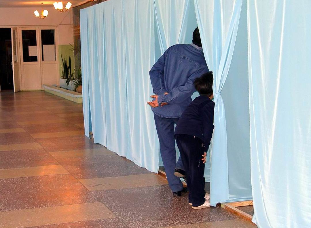 A voter's son and friend get a close-up view of voting procedures during parliamentary elections in Kazakhstan, 19 September 2004.