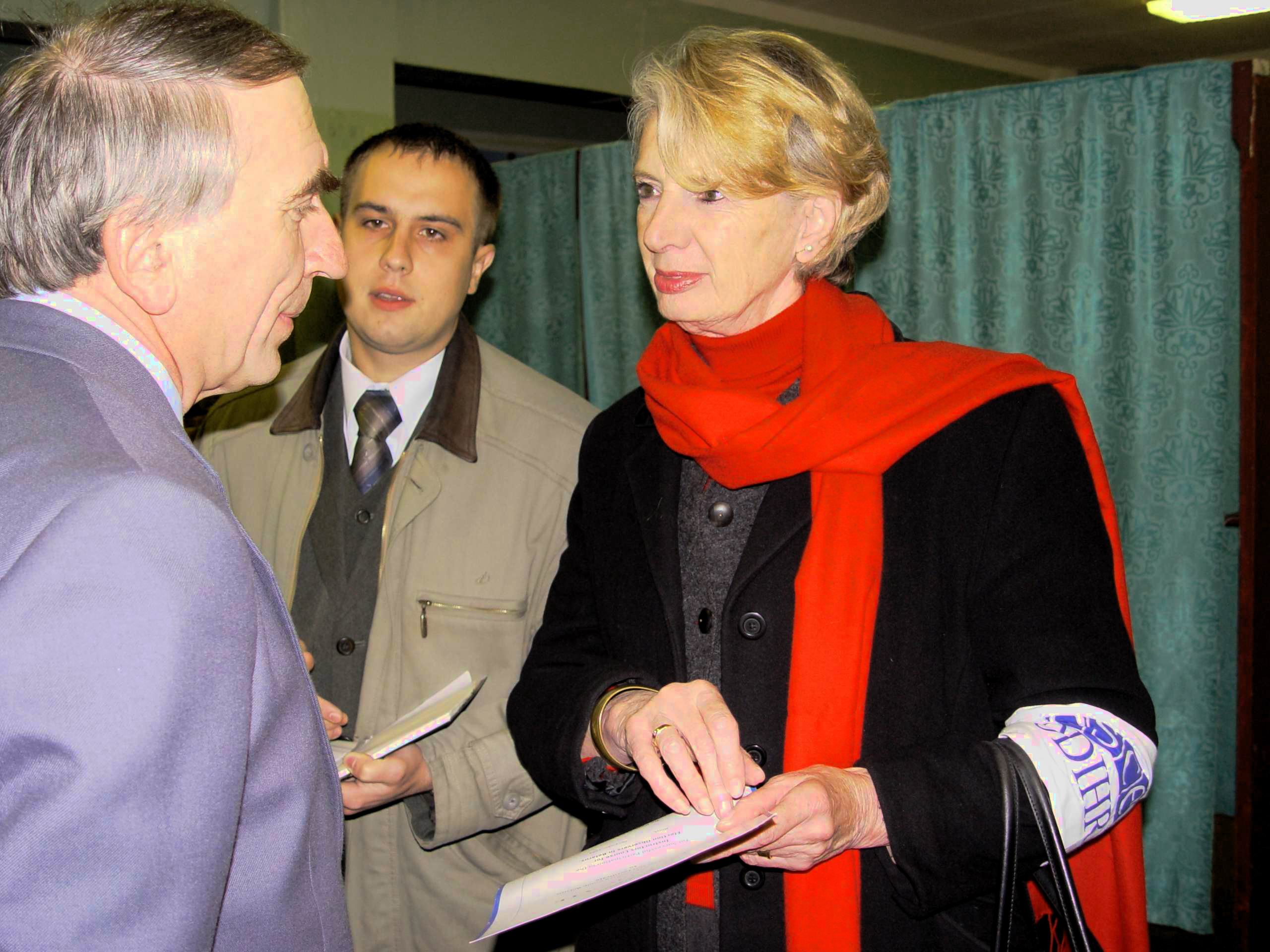 Head of the OSCE/ODIHR Election Observation Mission to Belarus, Amb. Audrey Glover (right), meets the chairperson of an election commission in Minsk during parliamentary elections, 17 October 2004.