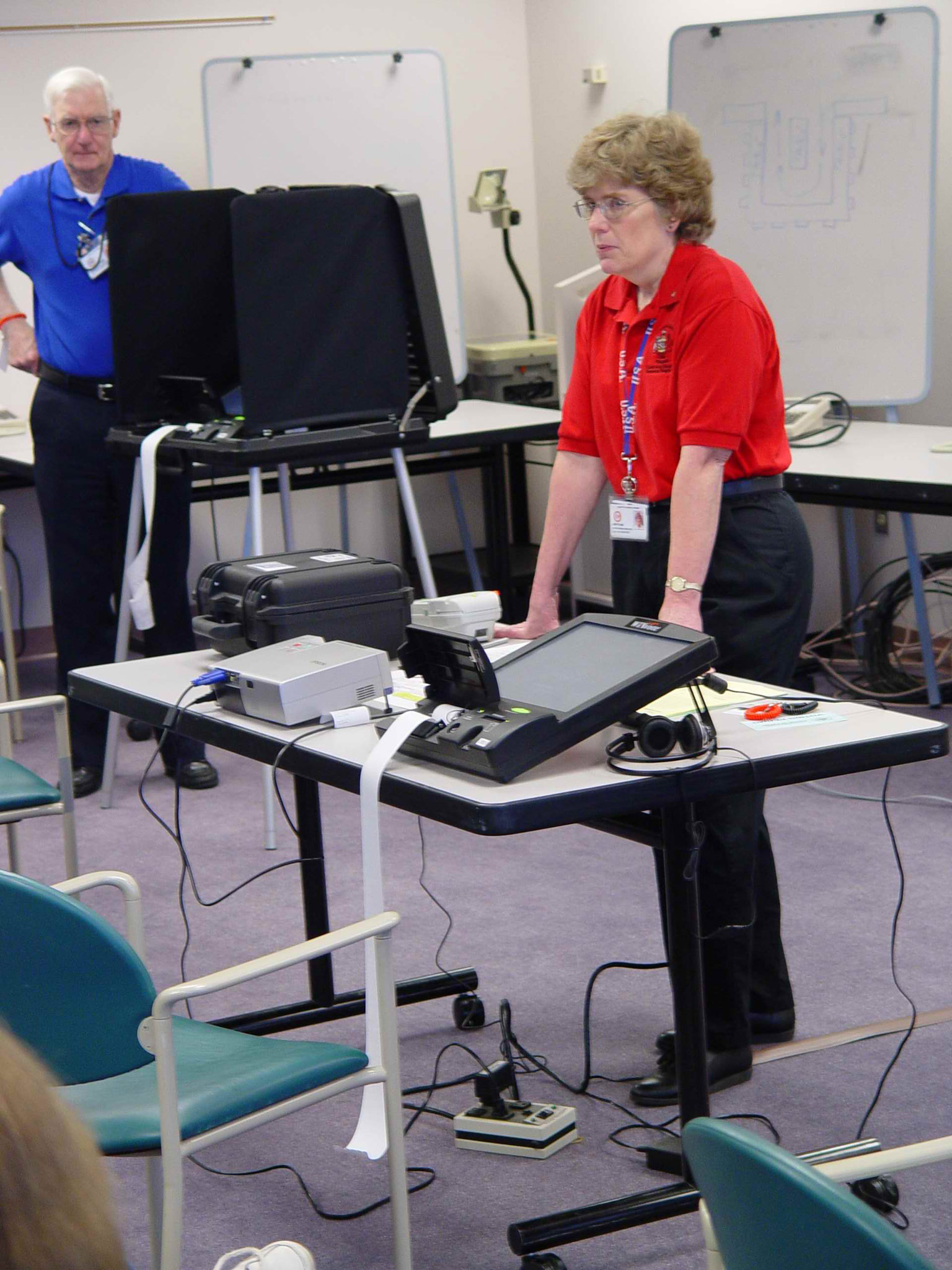 Polling board members in Fairfax, Virginia, introduce the operation of touch screen voting machines. One of the features of electronic voting there is the paper trail, which allows for recounting.