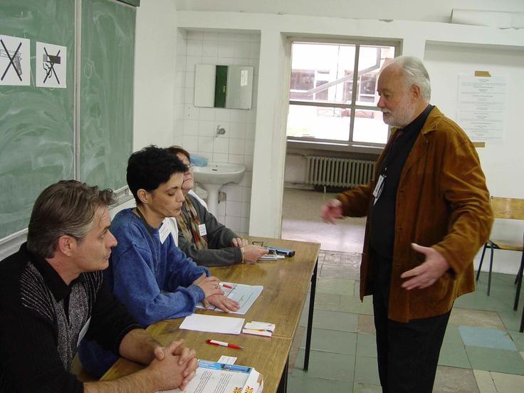 Ambassador Friedrich Bauer, head of the OSCE/ODIHR Observation Mission, speaks with election officials in Skopje during the 7 November 2004 referendum.