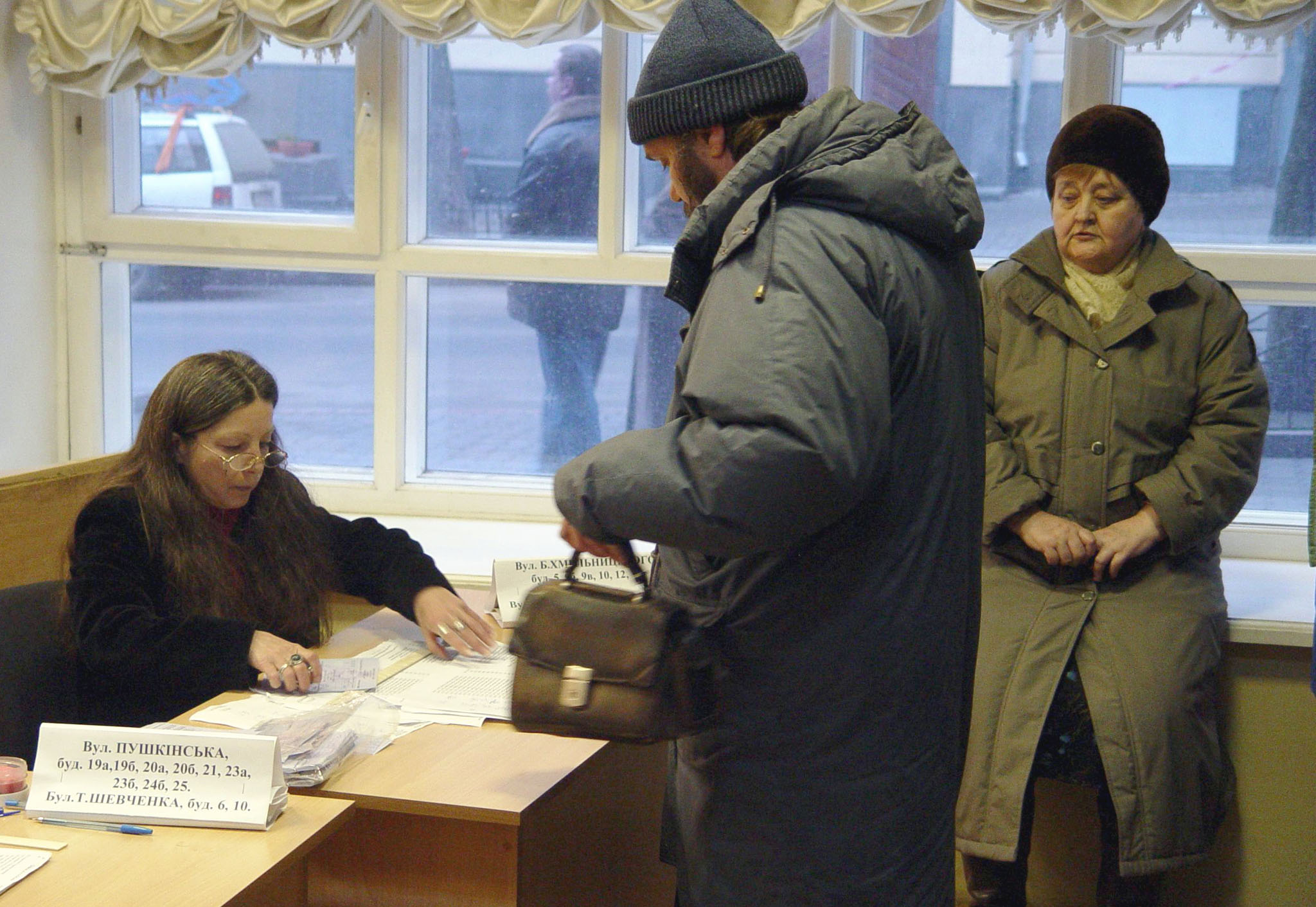 Voters registering at a polling station in Kyiv during the repeat second round of the presidential election on 26 December 2004.