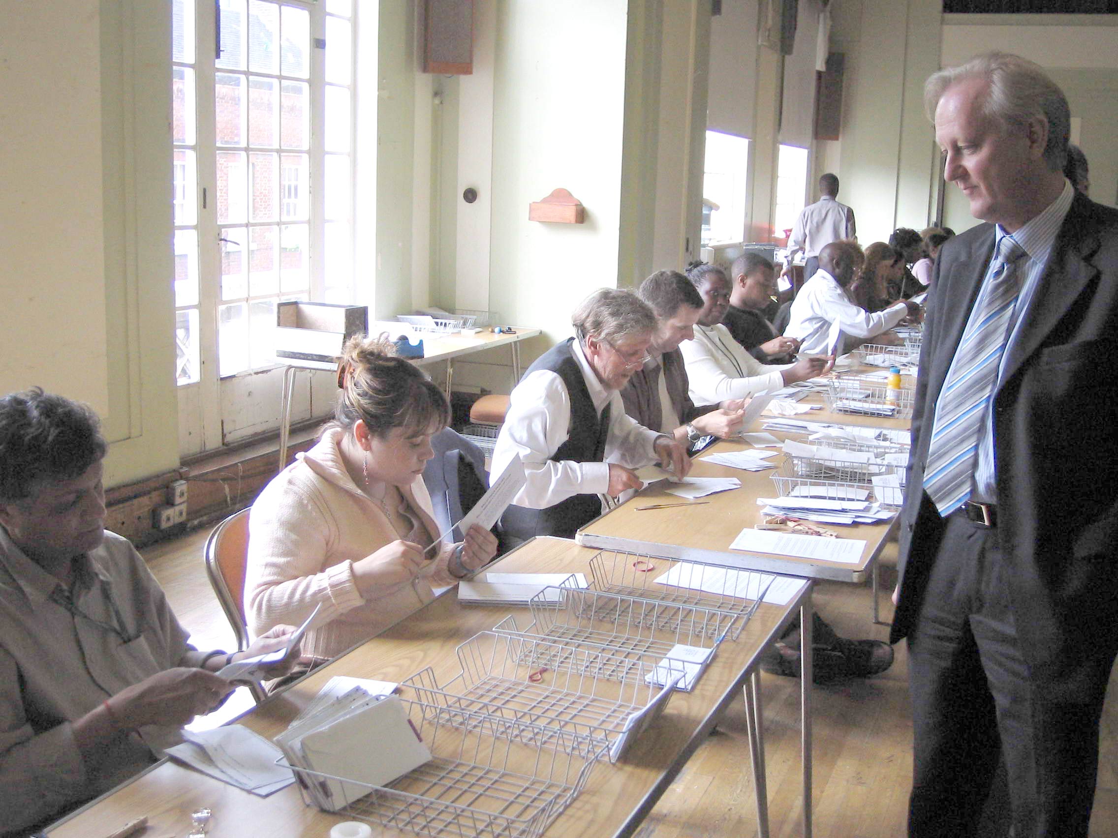 Kaare Vollan, who headed the OSCE/ODIHR Election Assessment Mission for the British general elections on 5 May 2005, observes counting in Hackney, East-London.