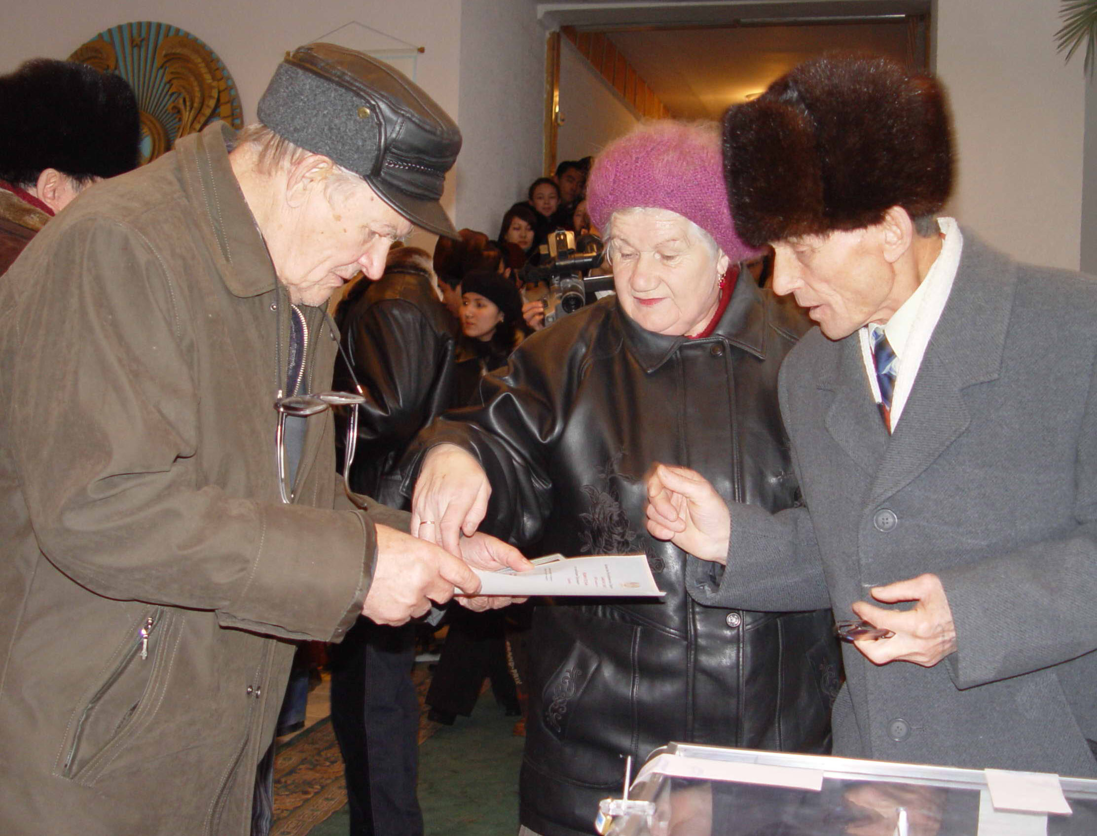 Voters in the 4 December 2005 presidential election in Kazakhstan before casting their ballots in the capital, Astana.