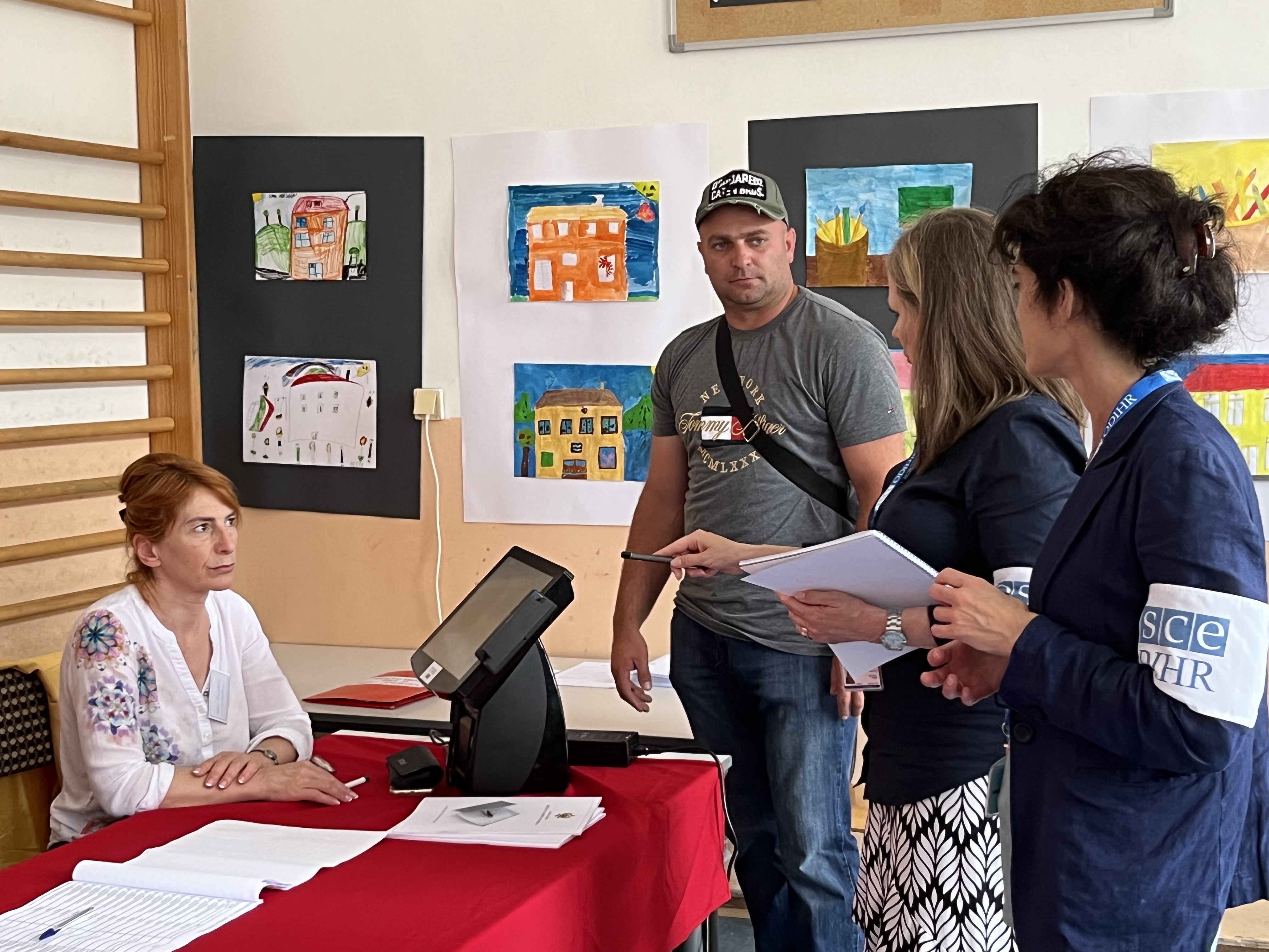 Observers from the OSCE Office for Democratic Institutions and Human Rights (ODIHR) speak to polling station officials during the early parliamentary elections in Montenegro. Podgorica, 11 June 2023.