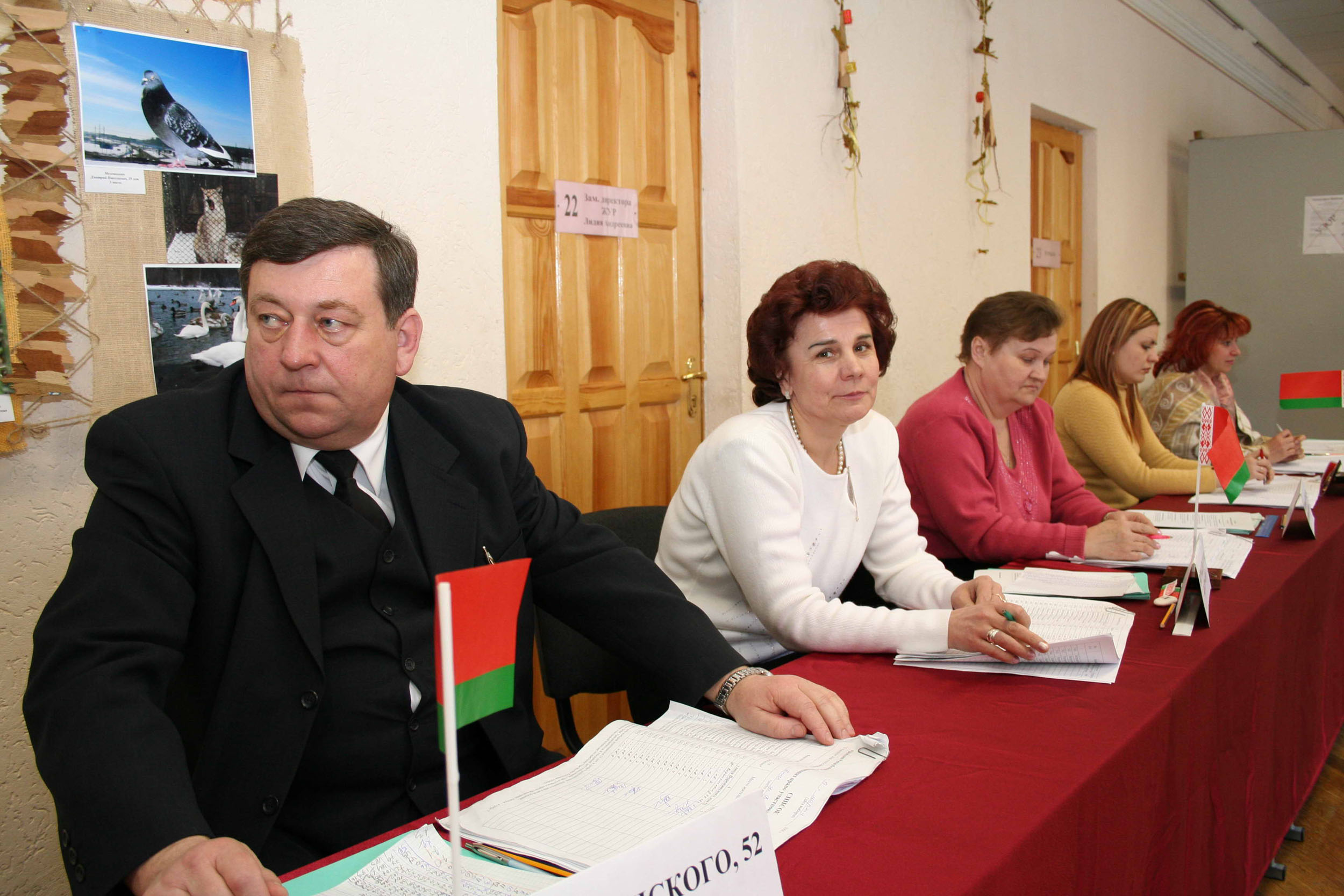 Staff members of a polling station in Minsk await voters during the 19 March 2006 presidential election in Belarus.