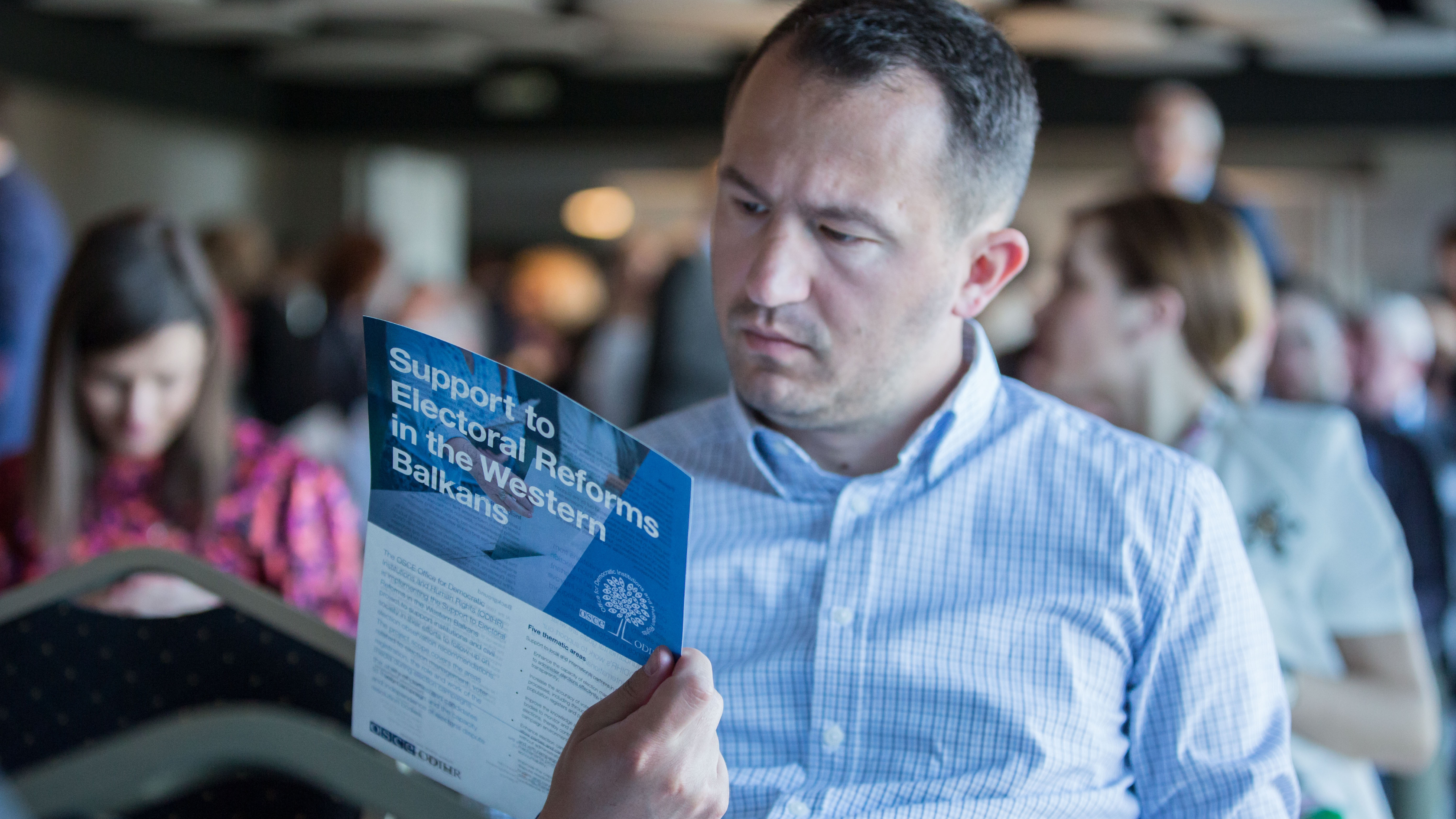 Participant reading a factsheet at a regional conference to Support Electoral Reform in the Western Balkans, Podgorica, 17-18 May 2022.