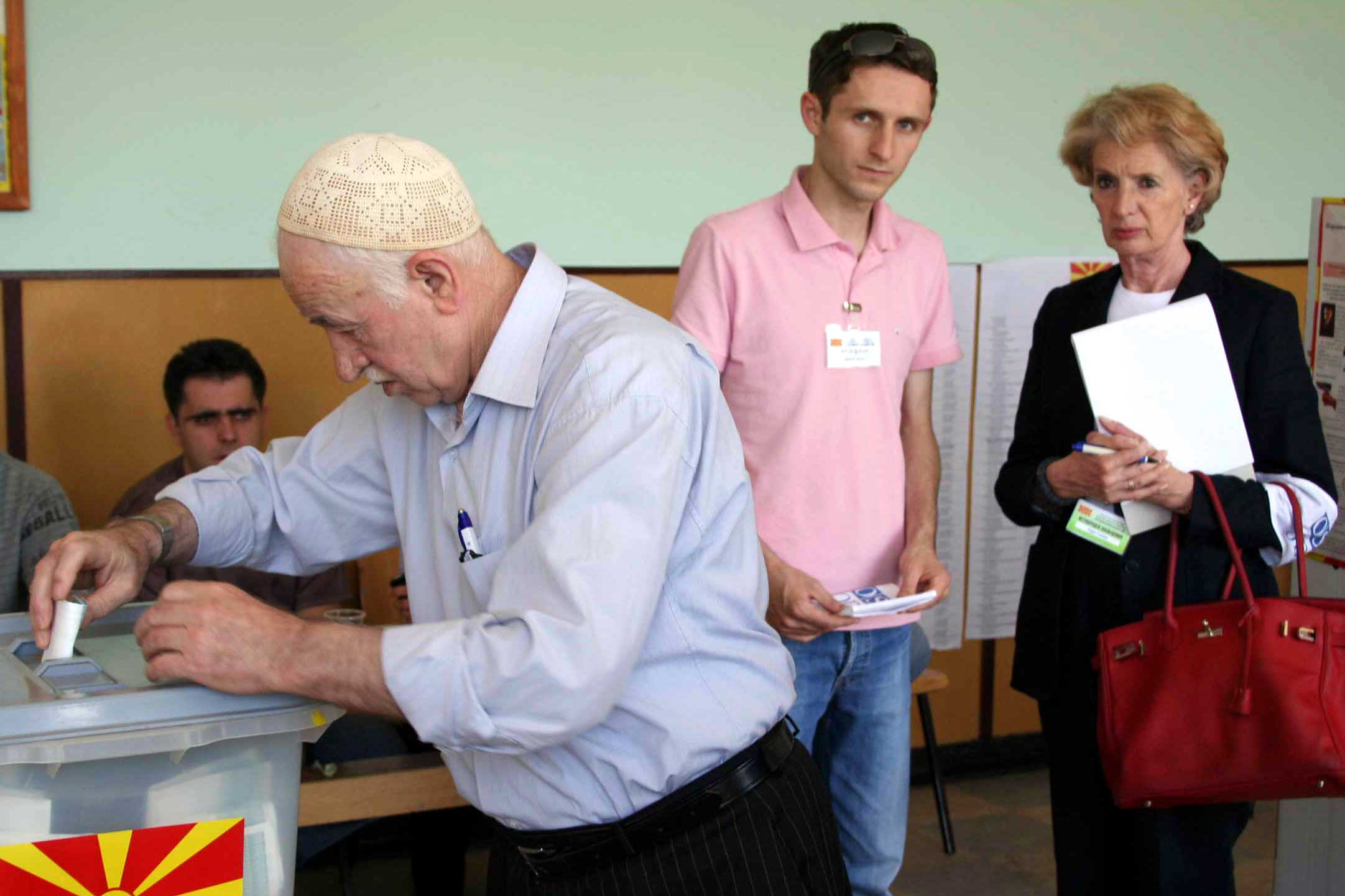 Ambassador Audrey Glover, head of the international election observation mission, observes voting in Skopje during parliamentary elections in the former Yugoslav Republic of Macedonia, 5 July 2006.