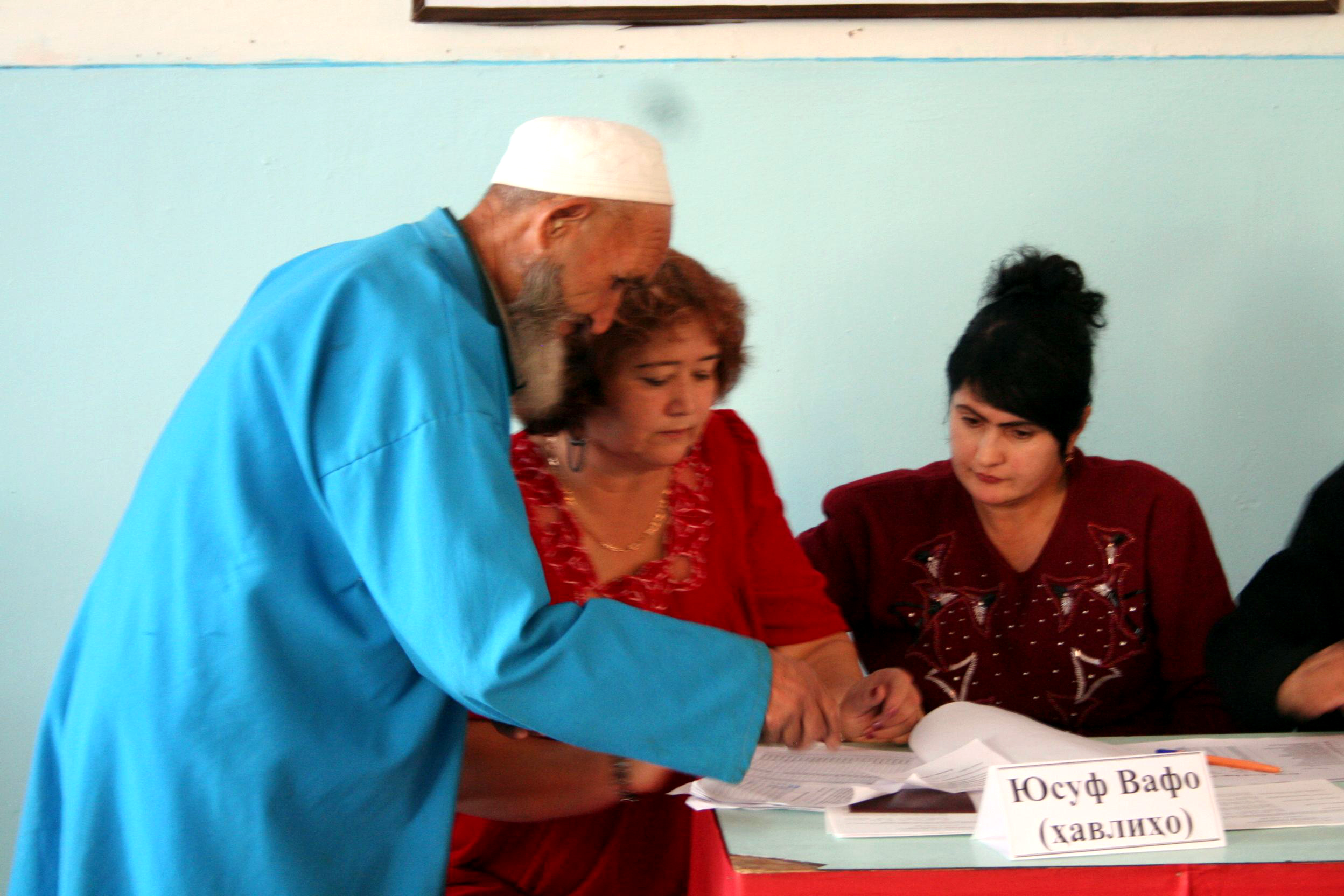 Volunteers assist a voter at a polling station in Dushanbe for Tajikistan's presidential election, 6 November 2006.