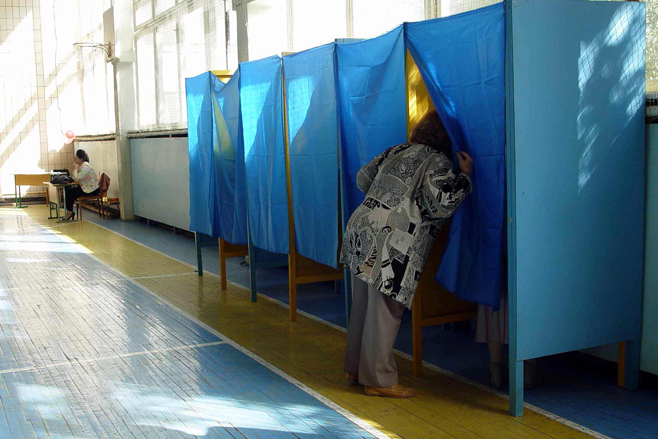 A woman looks into a voting booth at a polling station in Kyiv during parliamentary elections in Ukraine, 30 September 2007.