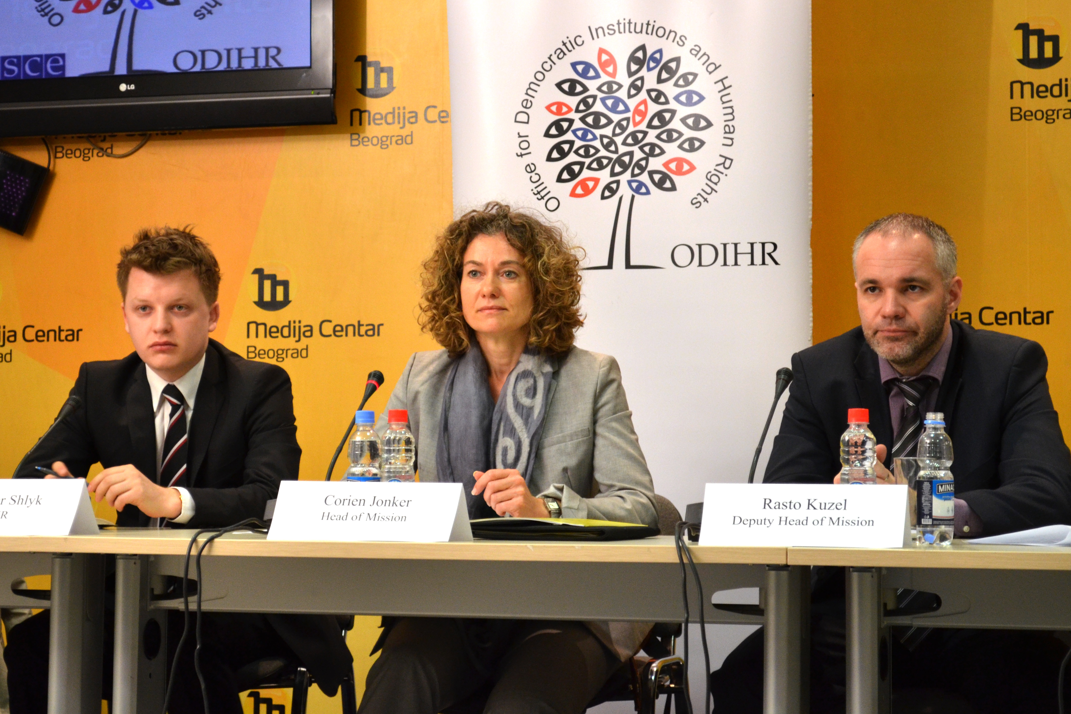 (L-r) Alexander Shlyk, ODIHR Election Adviser; Corien Jonker, Head of the OSCE/ODIHR Limited Election Observation Mission (LEOM) to the May 6 early parliamentary elections in Serbia, and Rasto Kuzel, Deputy Head of the LEOM, take questions from journalists at the launch of the LEOM in Belgrade, 4 April 2012.