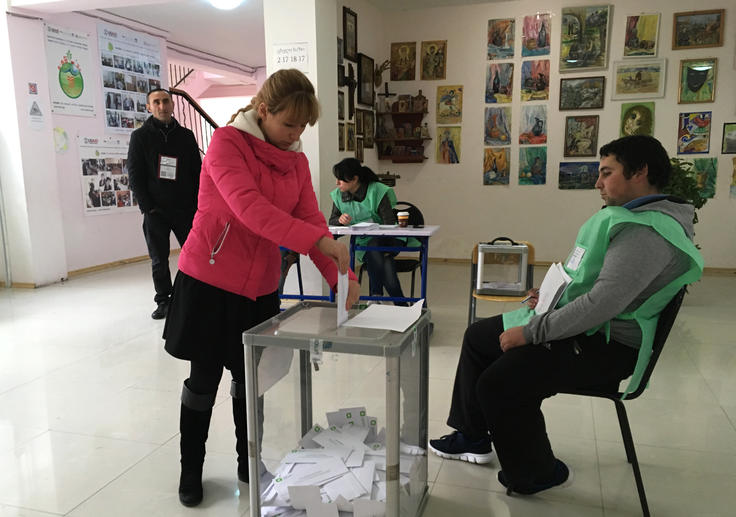 A voter casts her ballot in Georgia's second round of parliamentary elections in Mtskheta, 30 October 2016.