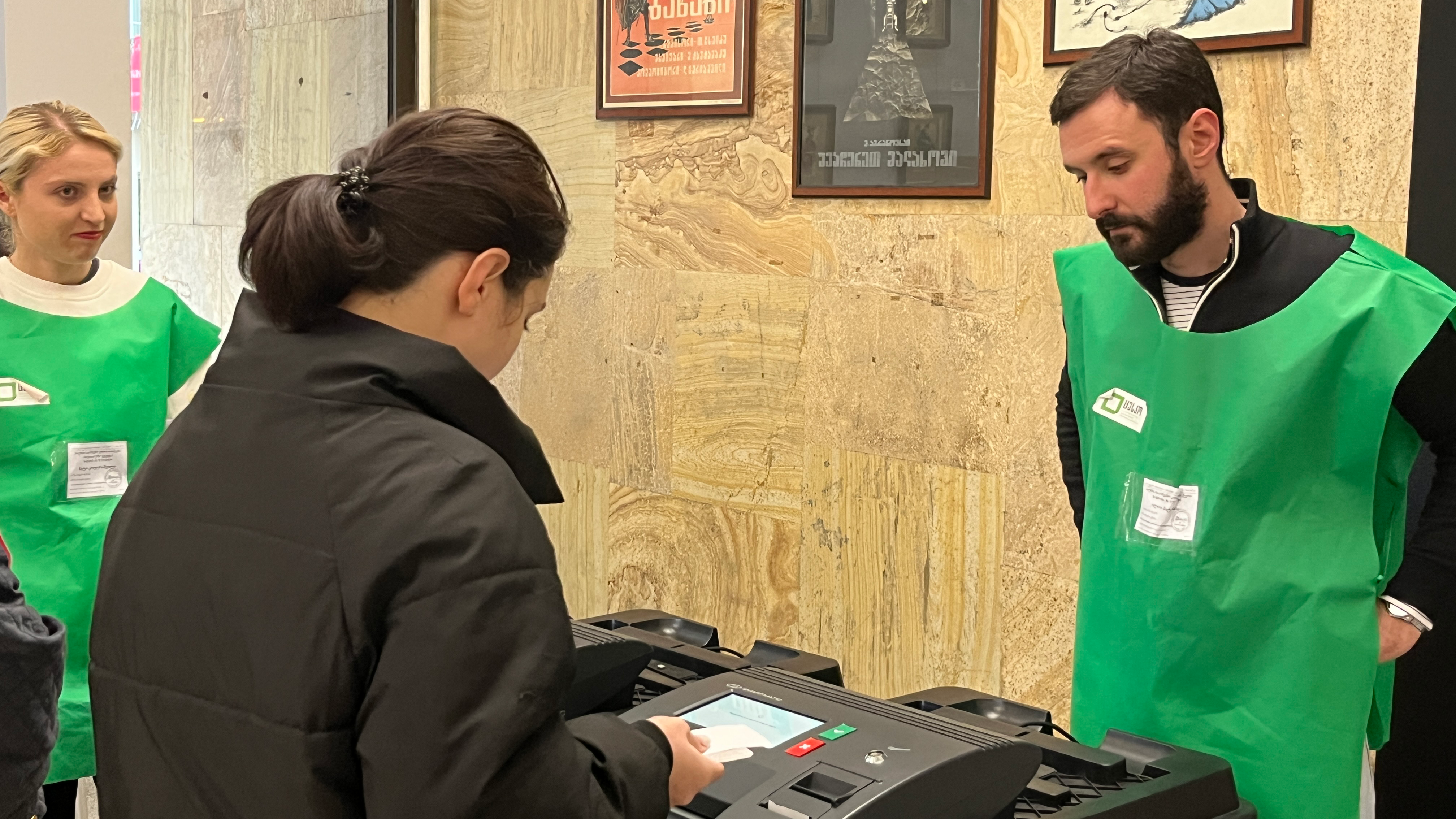 A polling station official assists a voter to cast her ballot during parliamentary elections in Georgia. Tbilisi, 26 October 2024