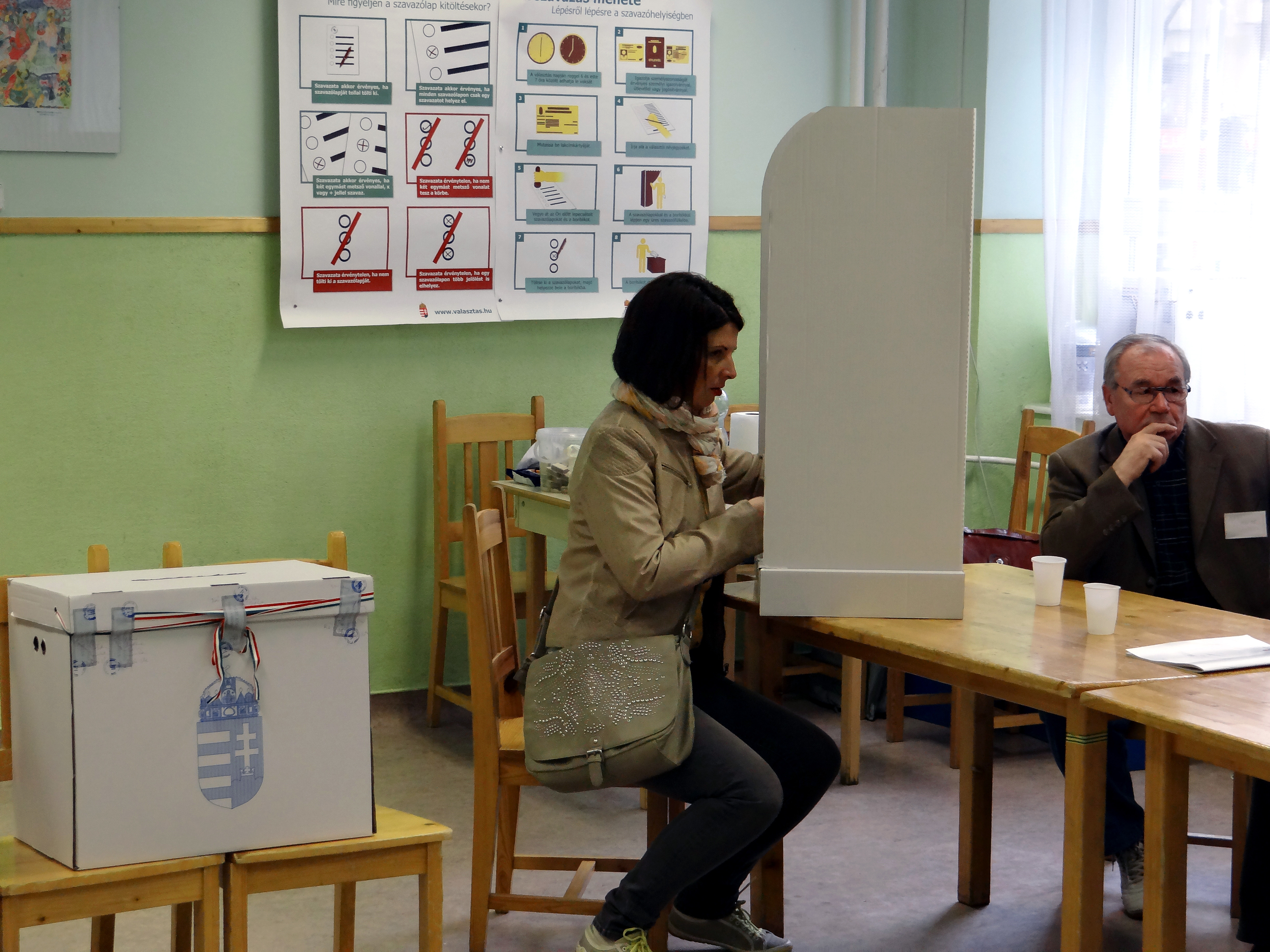 A voter filling out her ballot in Budapest during the parliamentary elections in Hungary, 6 April 2014.