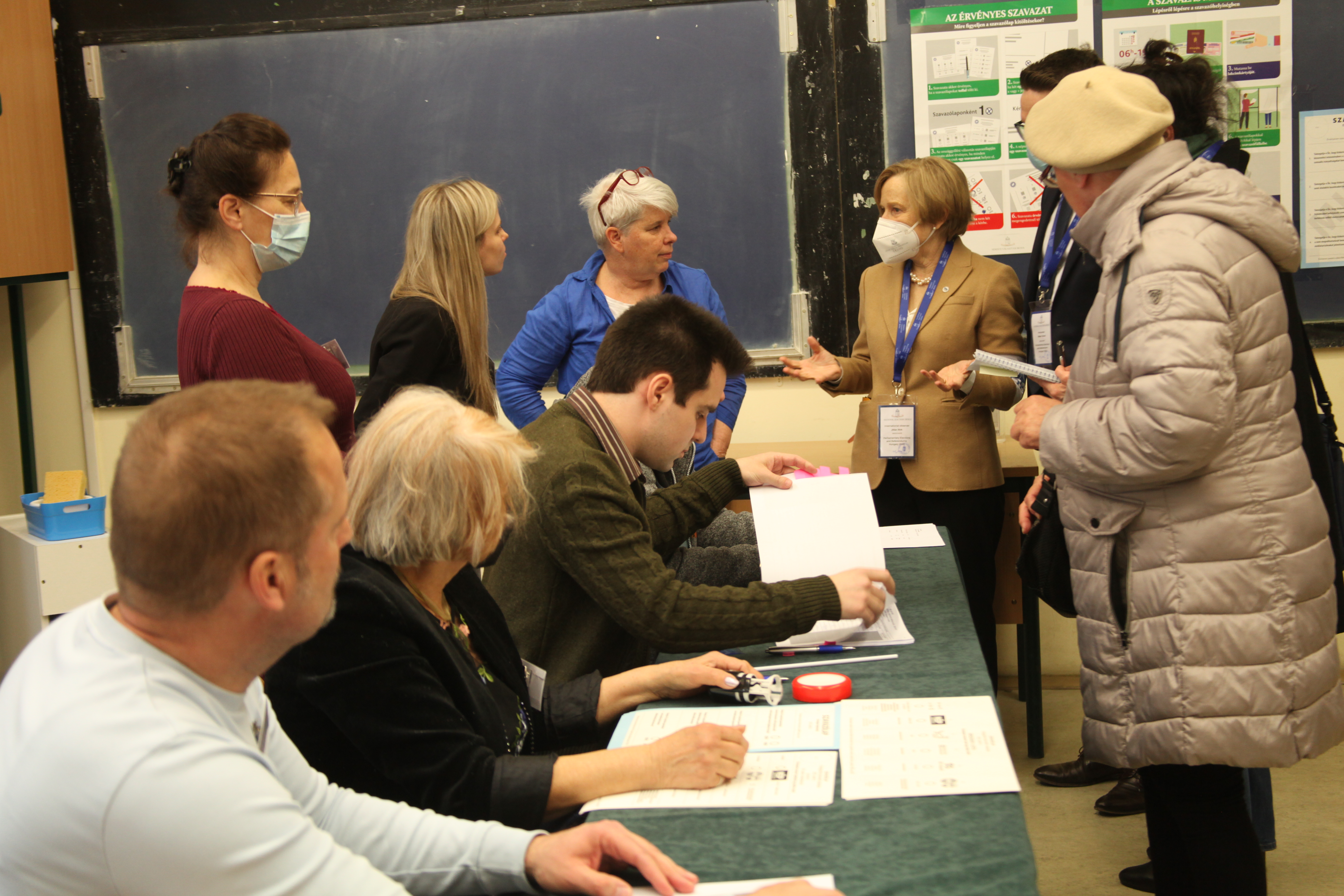 Ambassador Jillian Stirk, Head of ODIHR's Election Observation Mission, speaks to polling station officials in Budapest during Hungary's parliamentary elections. 3 April 2022