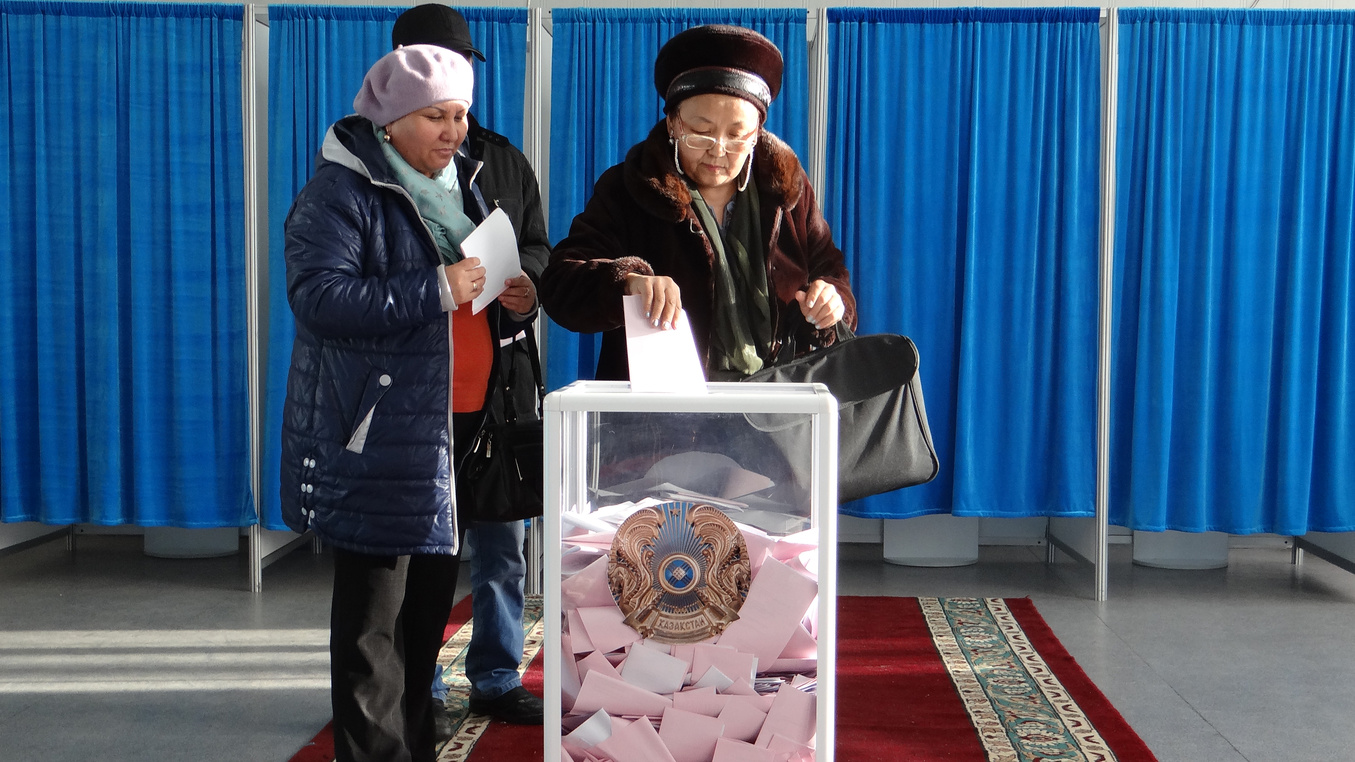 A voter in Astana casts her ballot as others wait during Kazakhstan's early parliamentary elections, 20 March 2016
