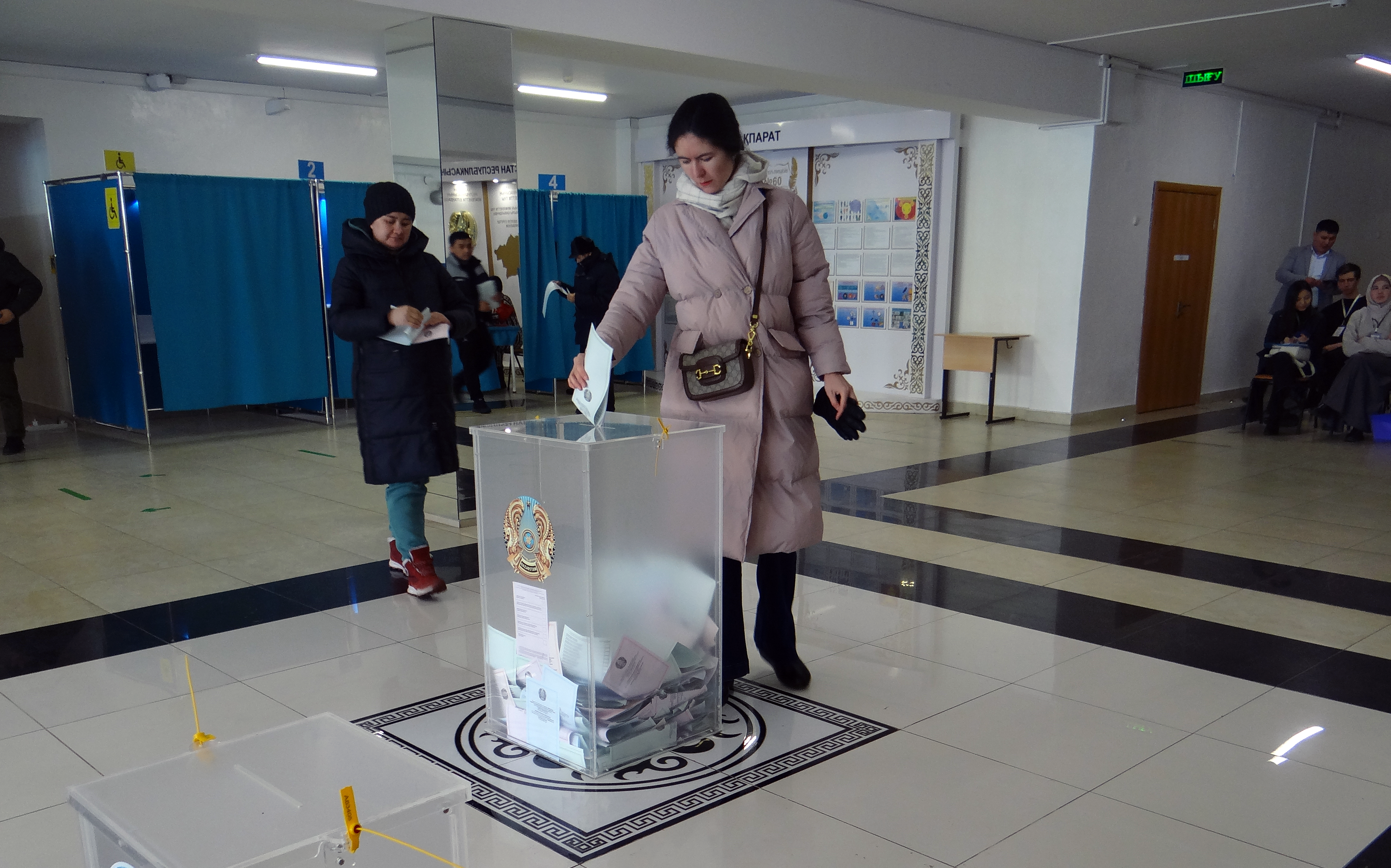 A voter casting her ballot at a polling station in Astana during Kazakhstan's early parliamentary elections, 19 March 2023.